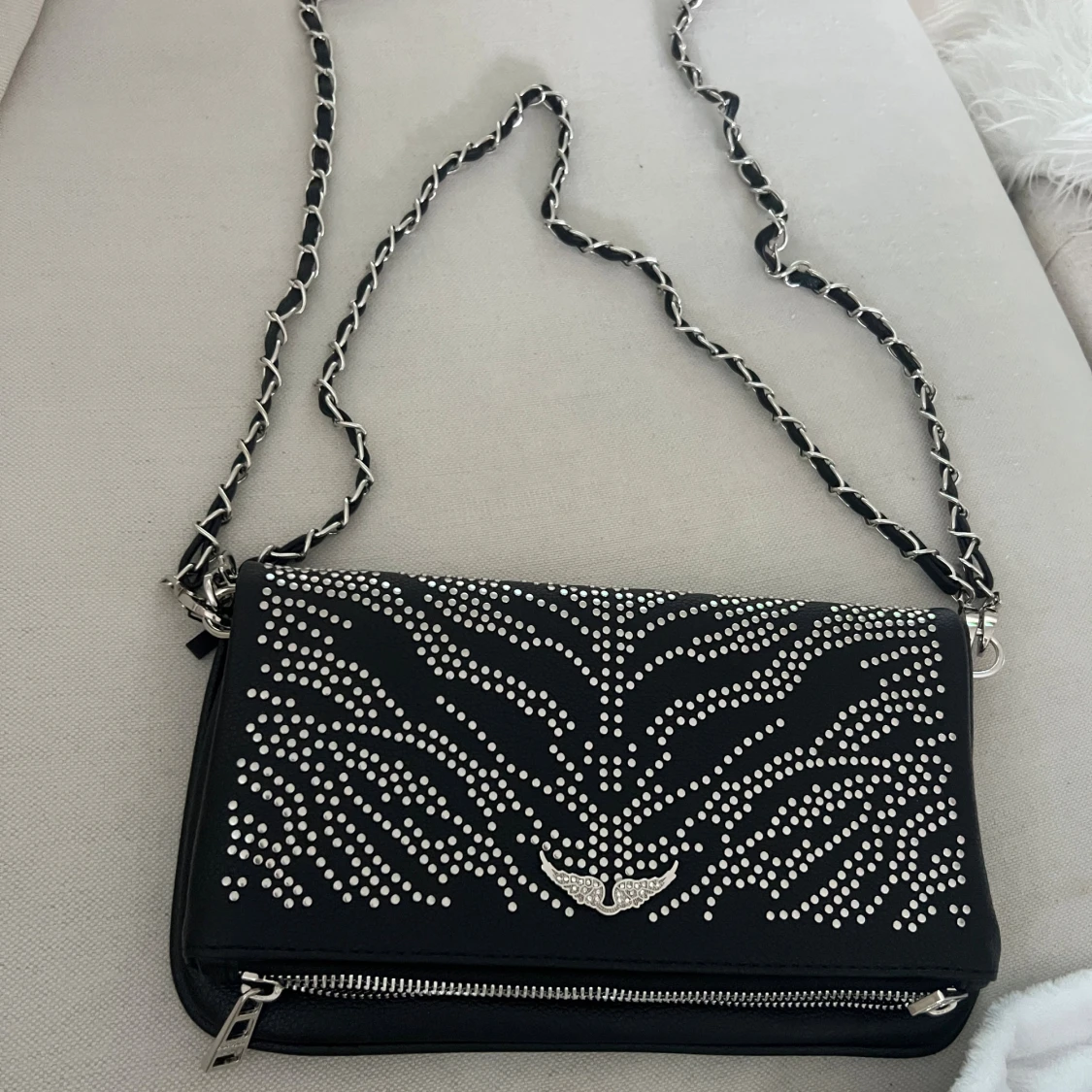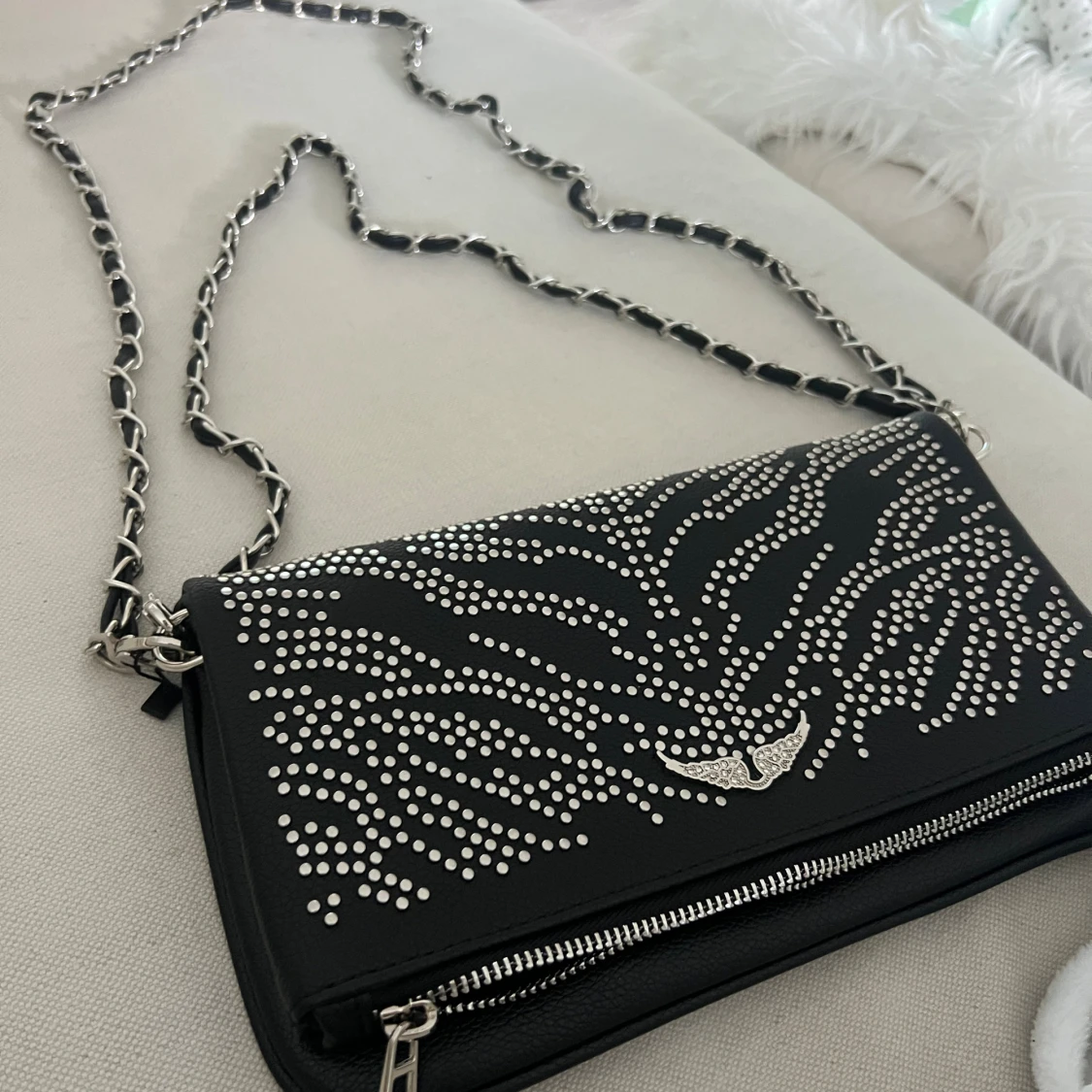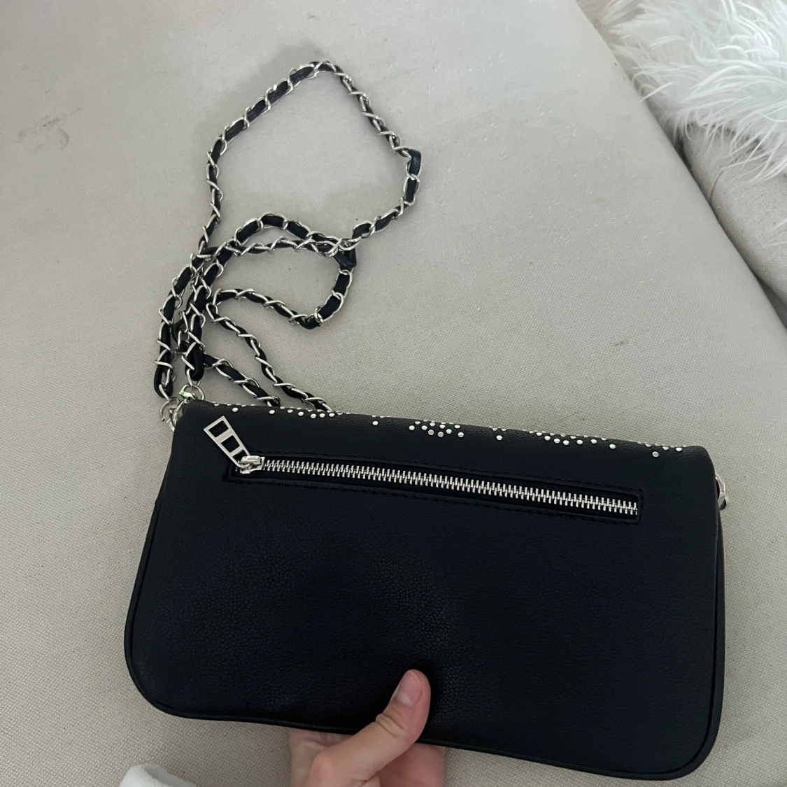 Cool svart axelväska med silverfärgade nitar i ett mönster på framsidan och en snygg kedja med inslag av svart läder. Väskan har dragkedja både fram och bak samt ett emblem med vingar i silver. Perfekt storlek för det viktigaste och ger en edgy vibe.