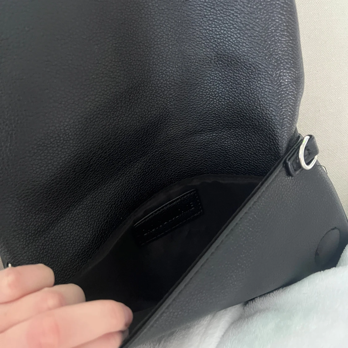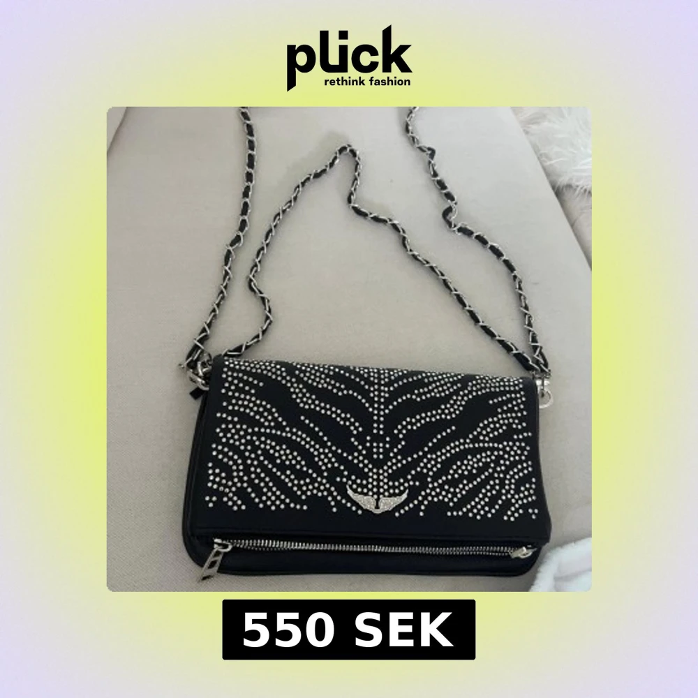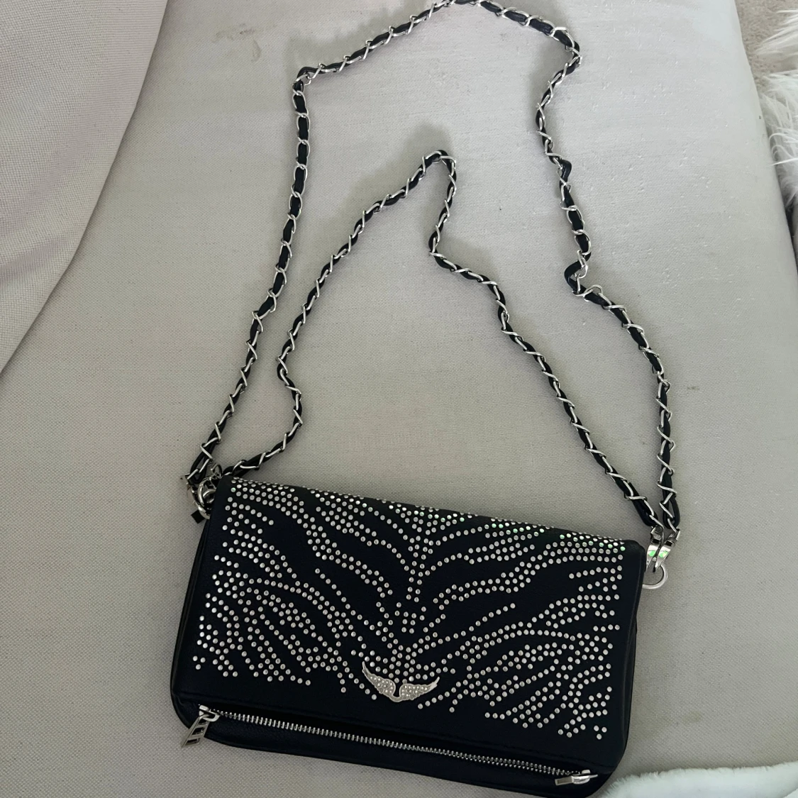 Cool svart axelväska med silverfärgade nitar i ett mönster på framsidan och en snygg kedja med inslag av svart läder. Väskan har dragkedja både fram och bak samt ett emblem med vingar i silver. Perfekt storlek för det viktigaste och ger en edgy vibe.