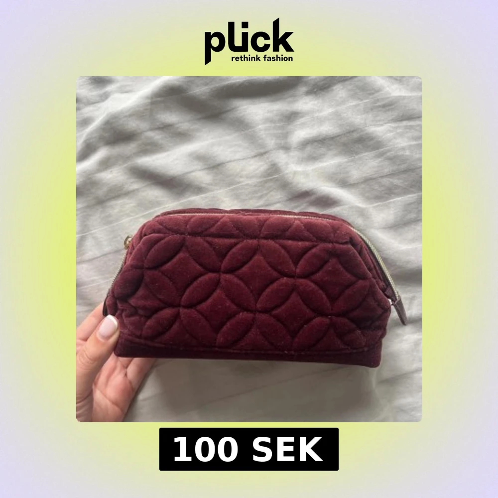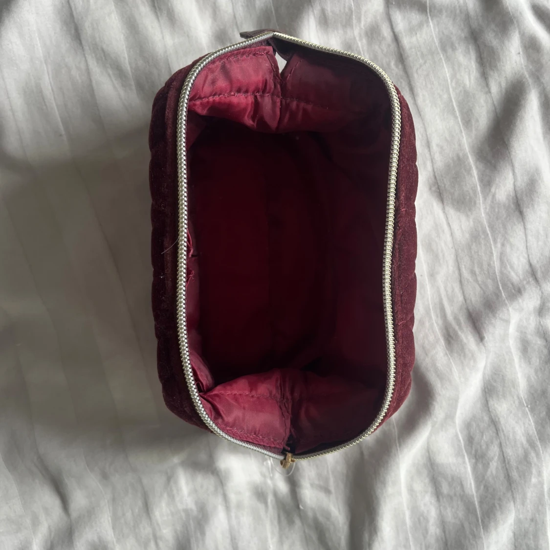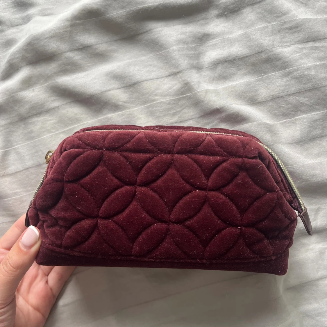 Vinröd quiltad necessär i mjuk sammet med snyggt geometriskt mönster. Väskan har dragkedja upptill och är rymlig inuti, perfekt för smink eller småprylar. Har aldrig använt!