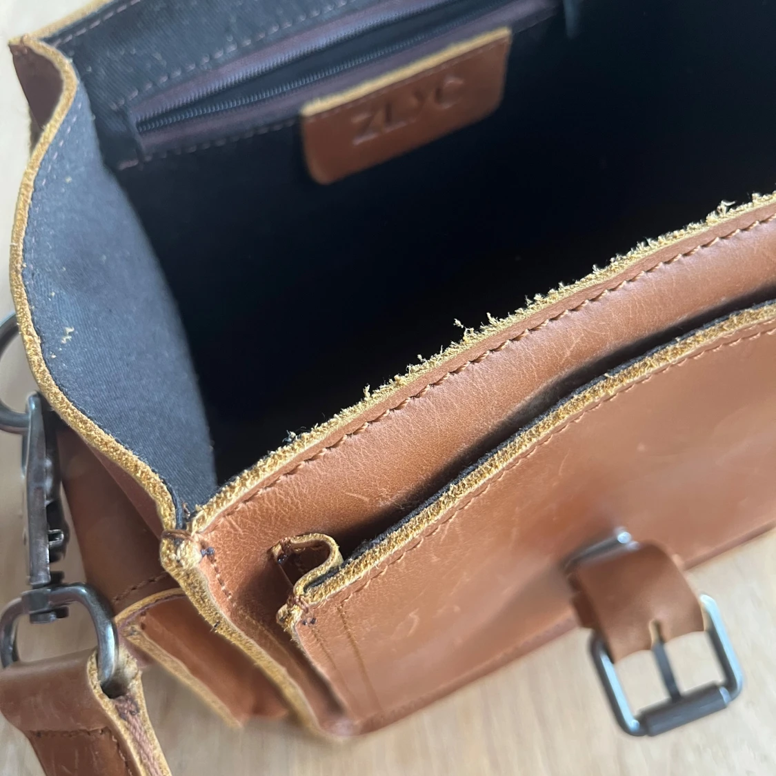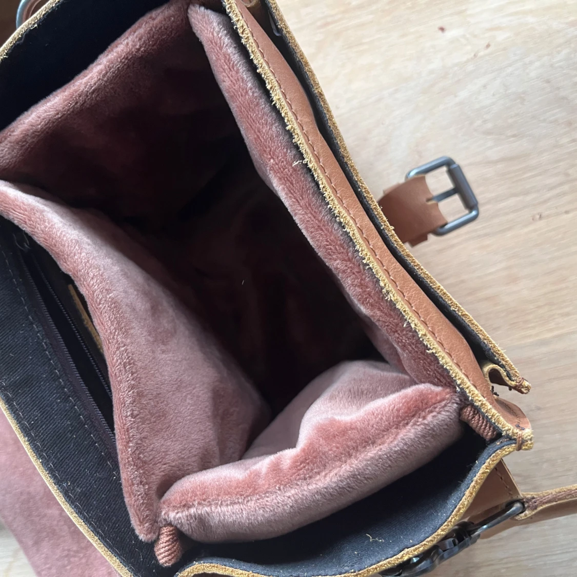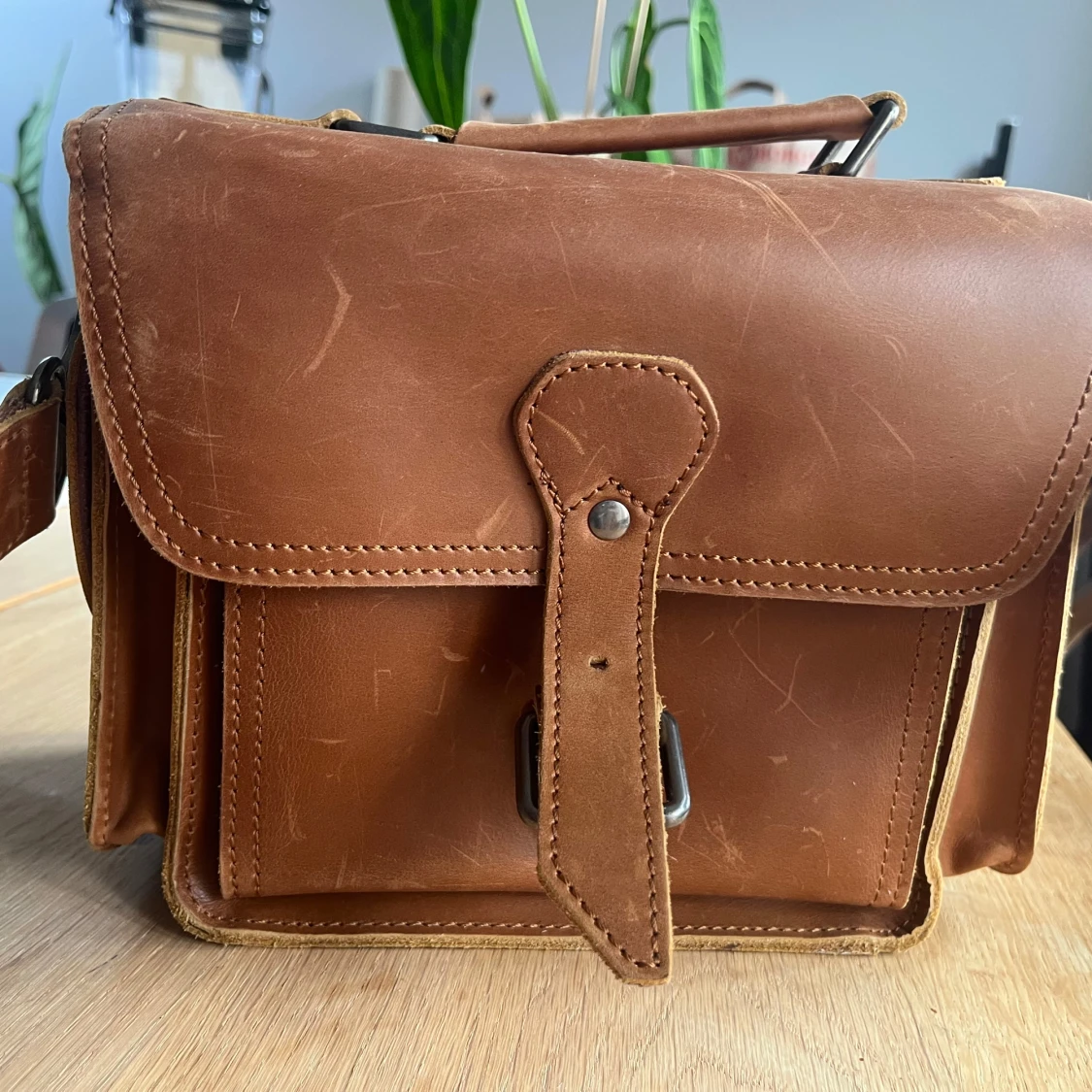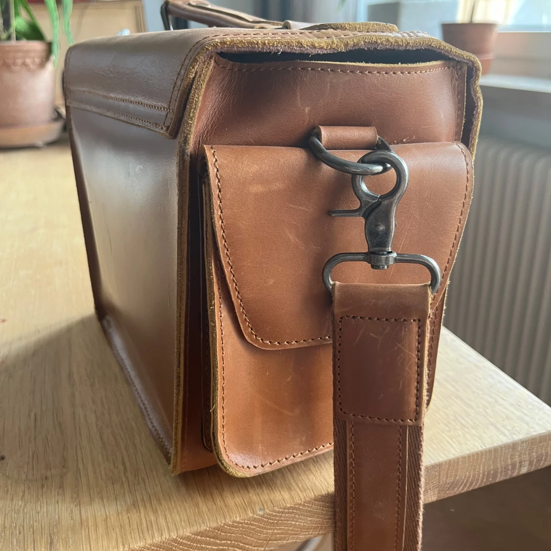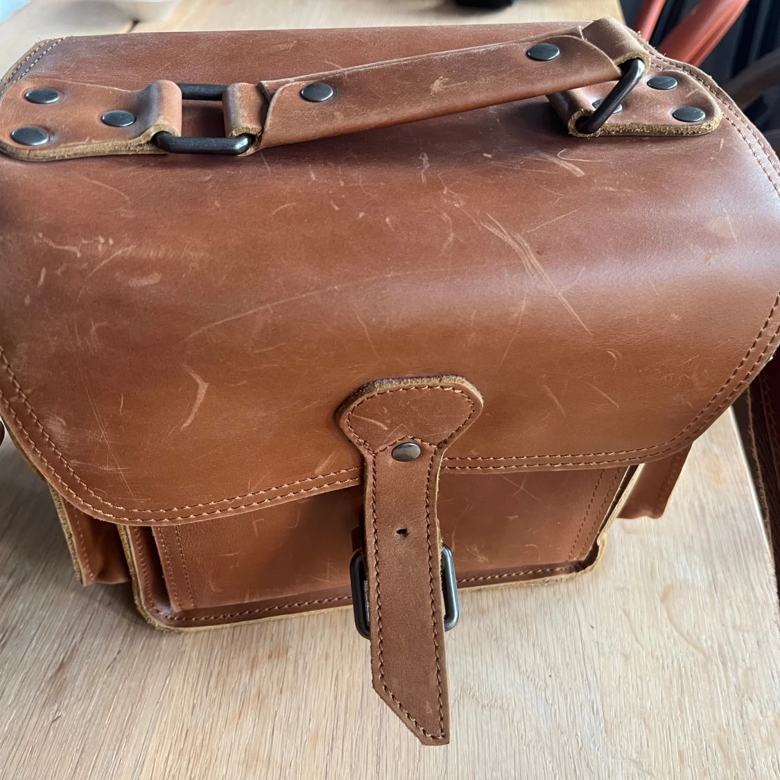 Helt oanvänd kameraväska i äkta läder. Passar till en systemkamera, med flera fack för tillbehör.