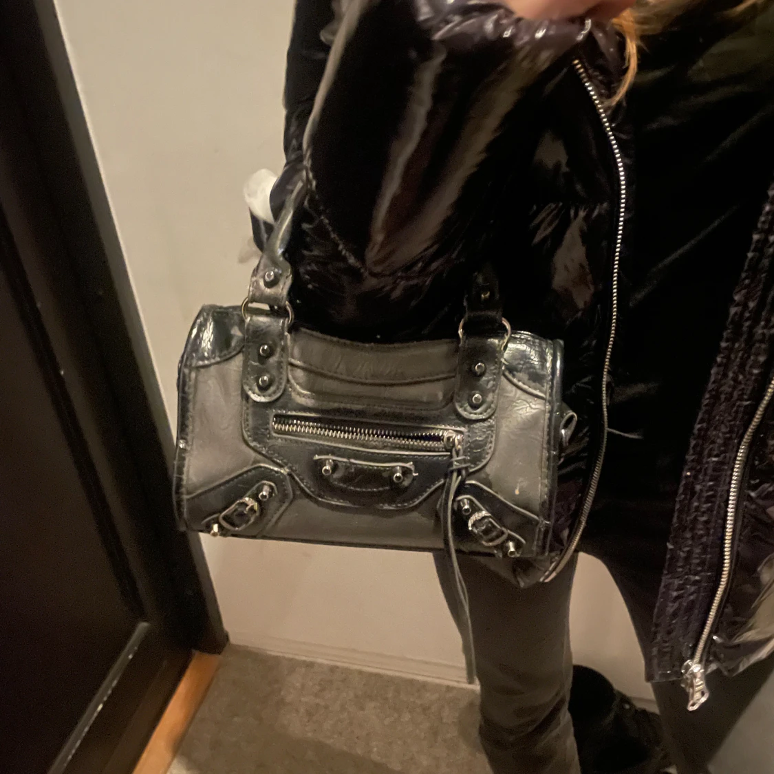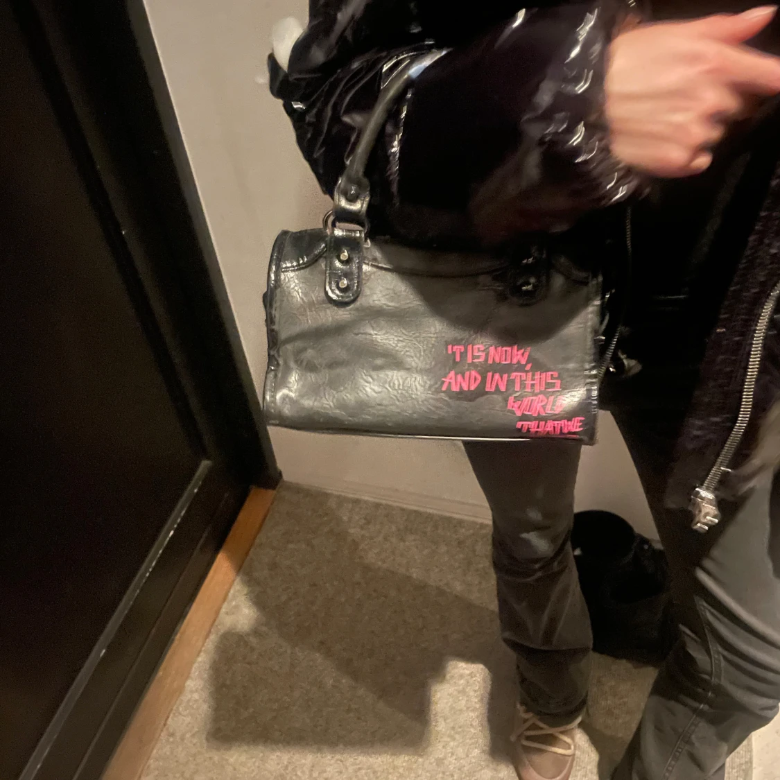 Säljer en cool och snygg svart axelväska i skinn med en unik rosa text på framsidan.