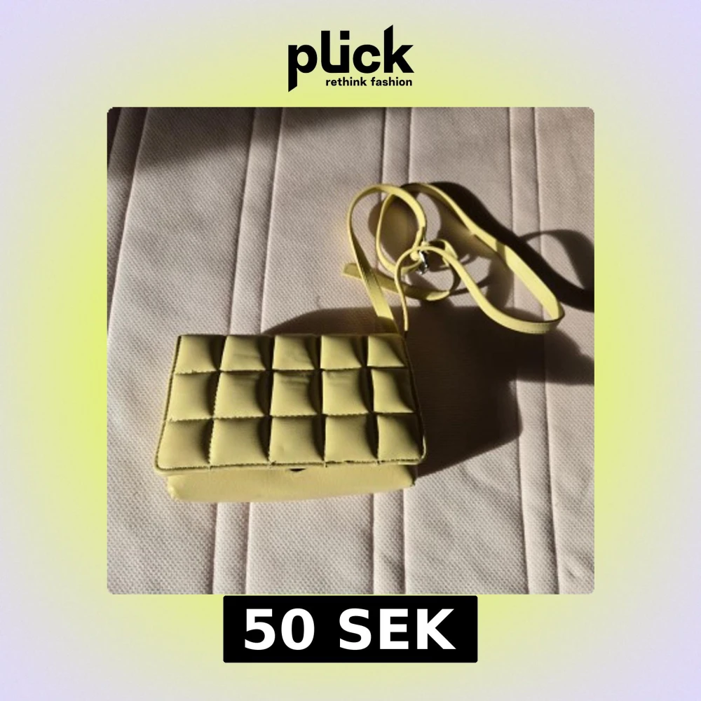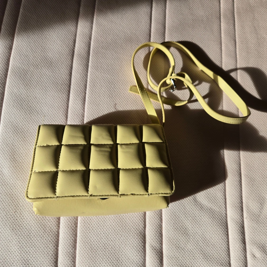 Trendig gul axelväska med quiltad design och lång axelrem. Väskan har en stilren, rektangulär form och är tillverkad i skinnimitation. Perfekt för att lyfta din outfit med en poppig färg och cool struktur.