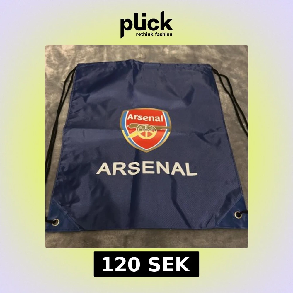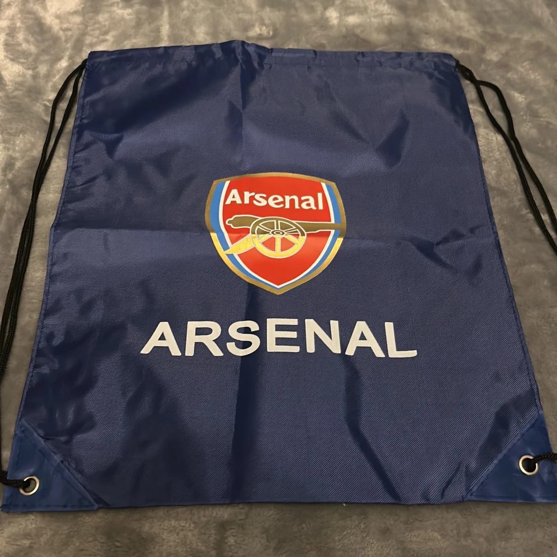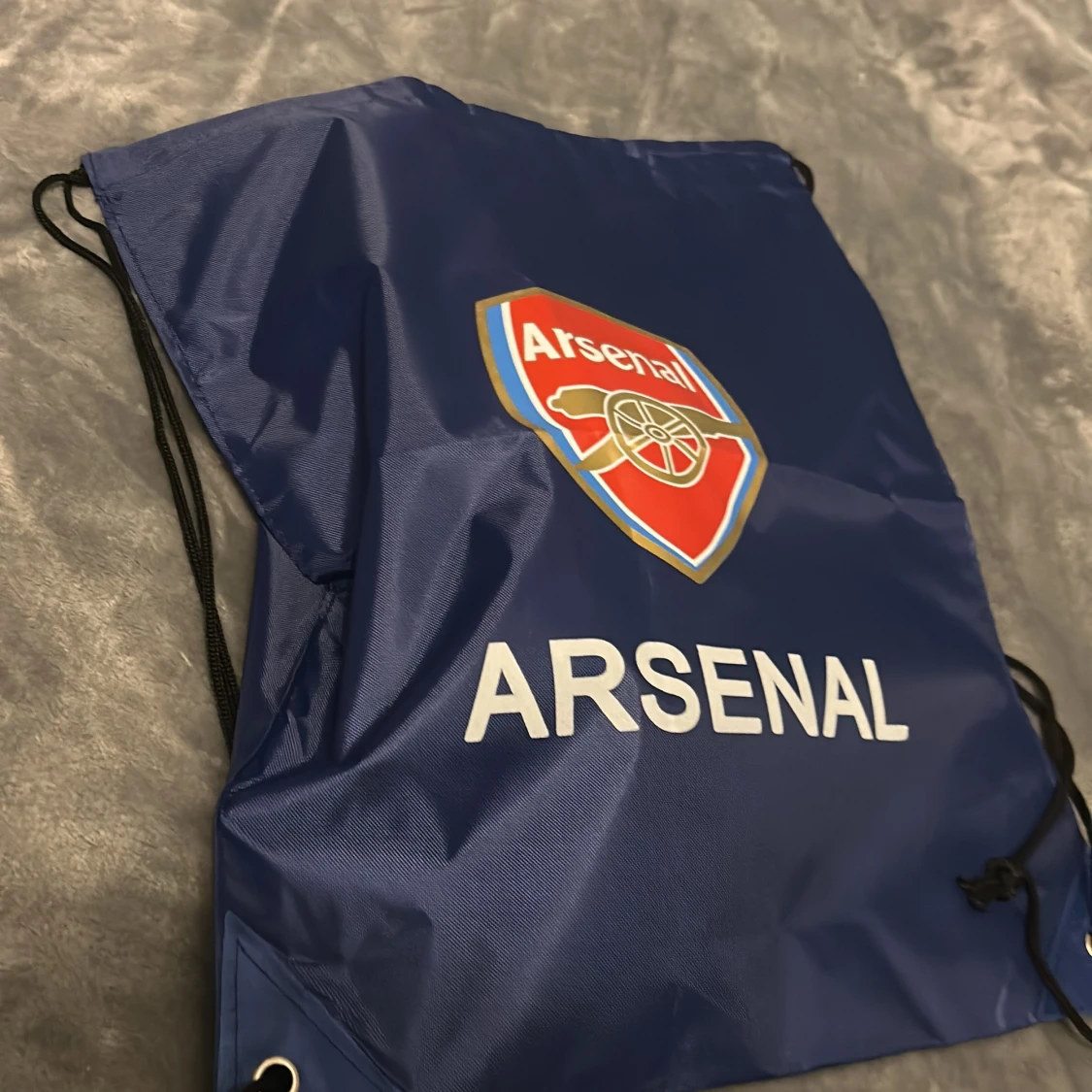 Snygg blå gympapåse med Arsenal-logga och text. Perfekt för att bära med sig träningskläder eller andra småsaker. Påsen har svarta snören för enkel stängning och bärning.