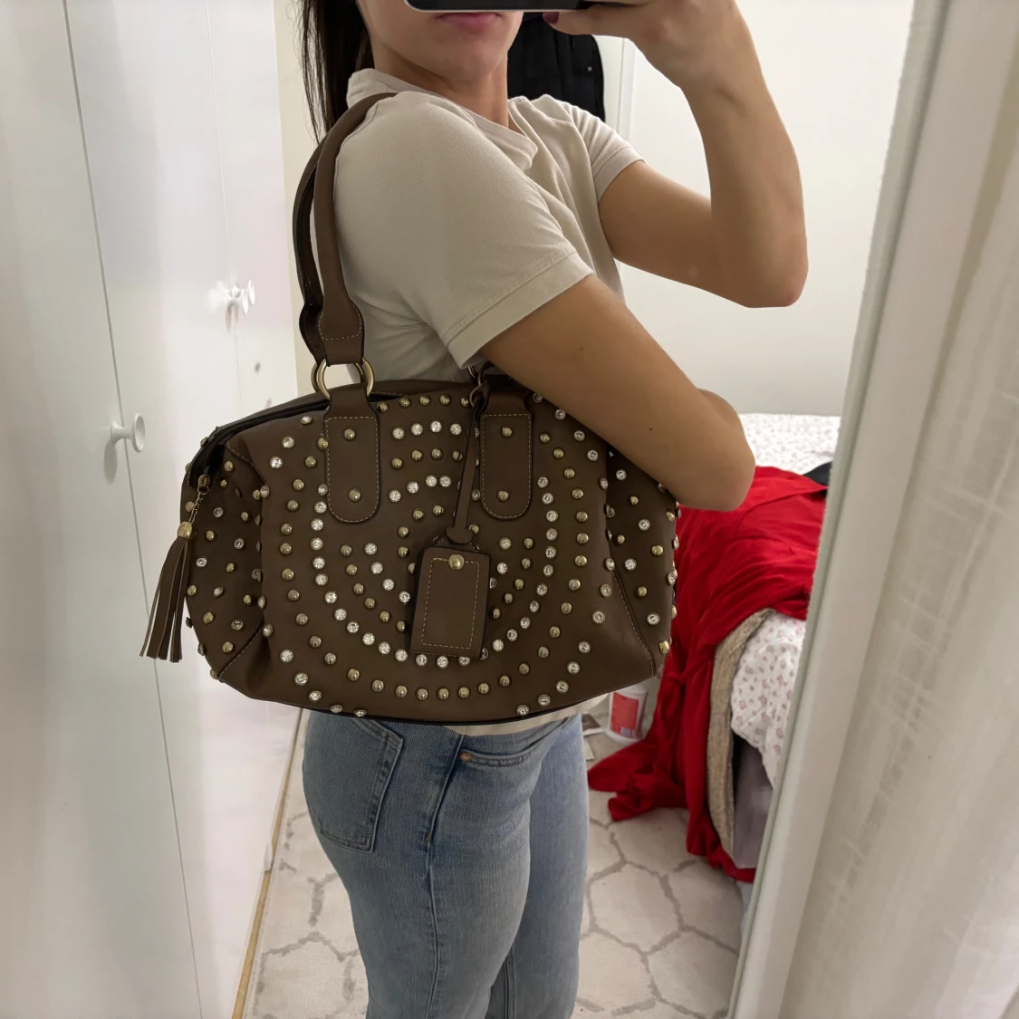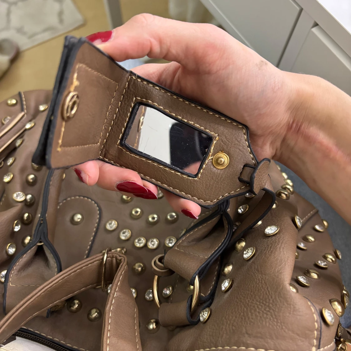 Snygg brun axelväska dekorerad med nitar i ett cirkulärt mönster. Väskan har dubbla handtag och en praktisk spegel på insidan. Perfekt för att ge din outfit en edgy touch.