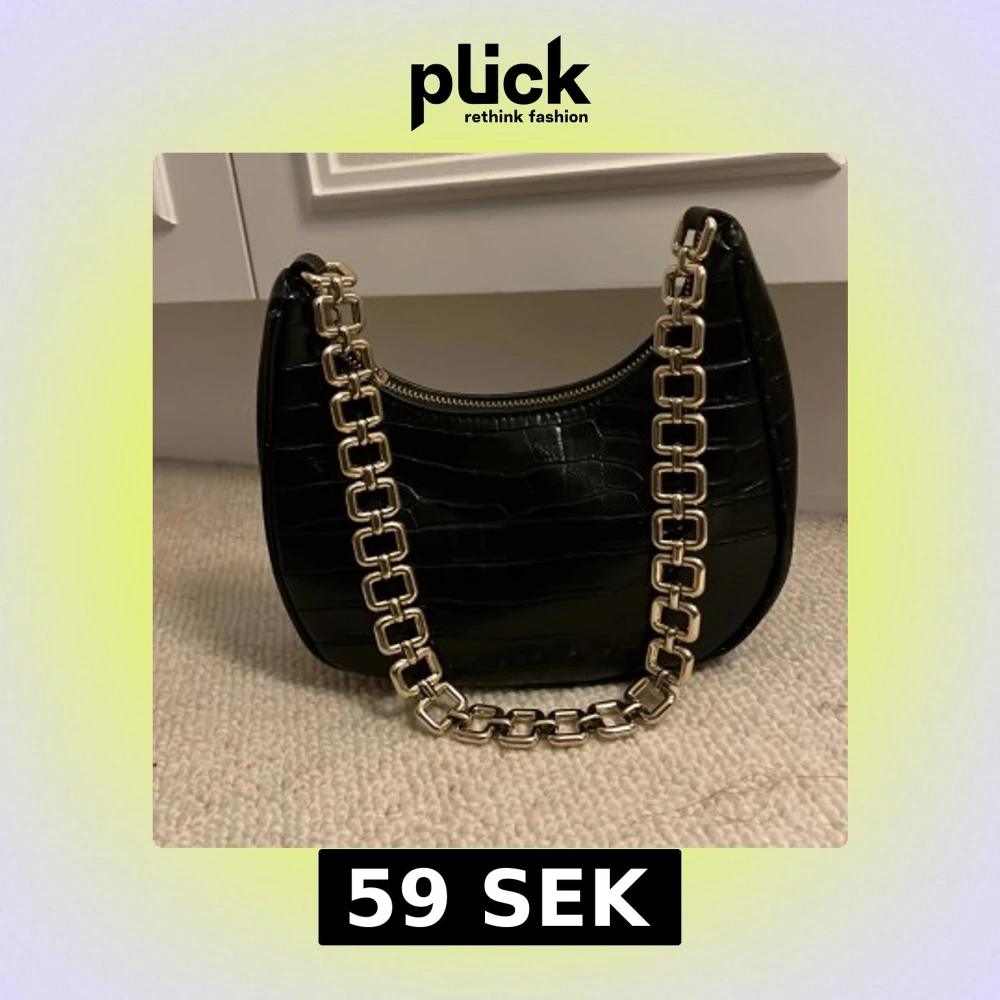 Snygg svart axelväska i croco-mönstrat skinnimitation med chunky guldfärgad kedja som axelrem. Väskan har en rundad form och stängs med dragkedja upptill. Perfekt för att lyfta vilken outfit som helst.