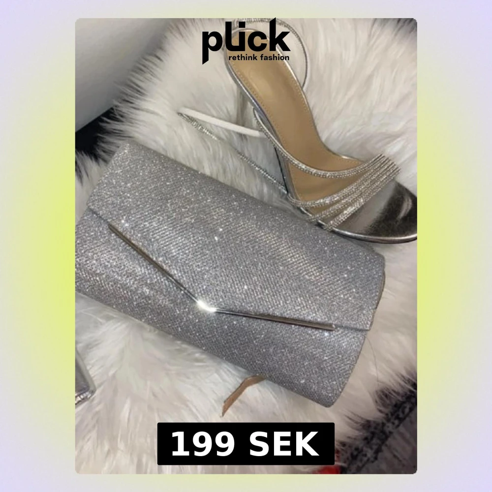 Snygg kuvertväska i glittrig silver med stilren metall-detalj på framsidan. Perfekt storlek för mobilen och det viktigaste. Väskan har en elegant och modern look som lyfter din outfit till nästa nivå.