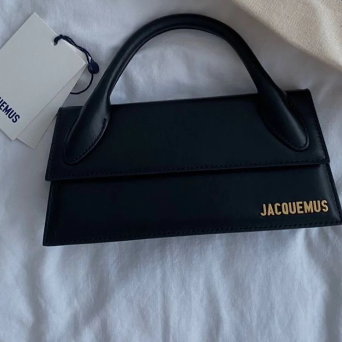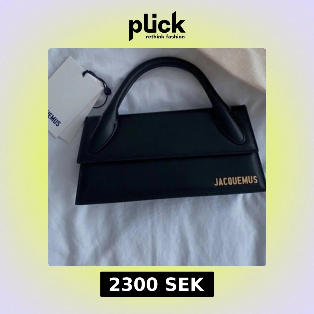 Säljer en svart handväska från Jacquemus med stilren, rektangulär form och ett elegant handtag. Väskan är i skinn och har guldigt Jacquemus-logo på framsidan. Perfekt för dig som gillar minimalistisk och trendig design. Design namn Jacquemus Le chiquito long ord.pris 7,638kr