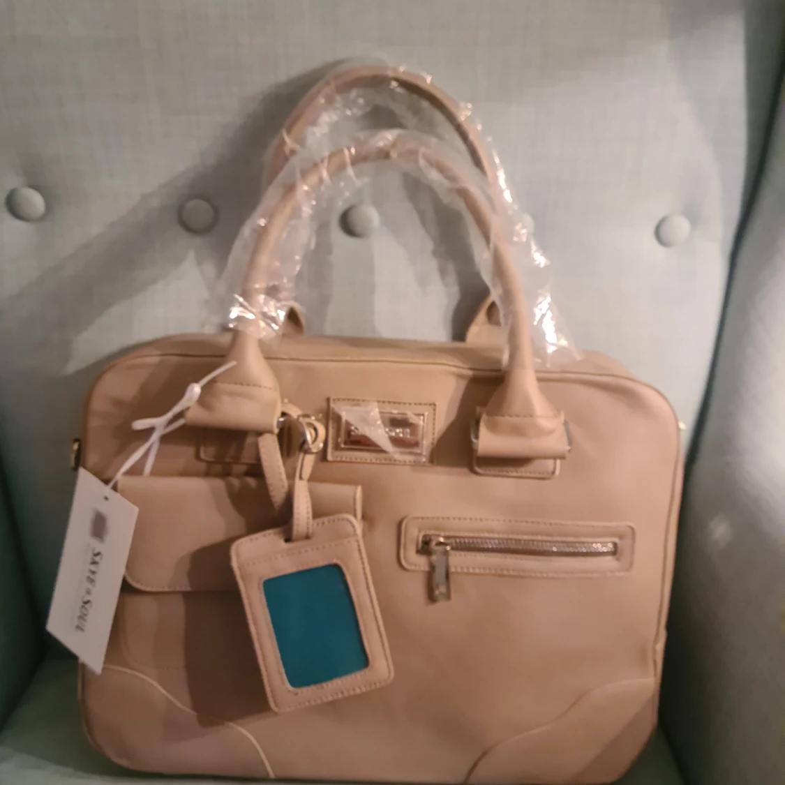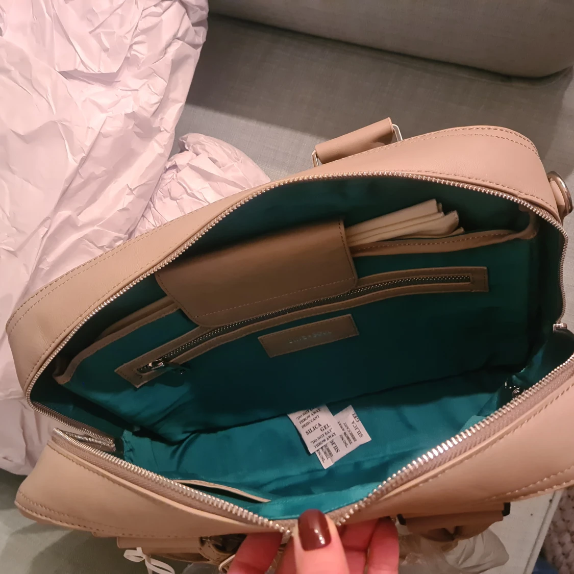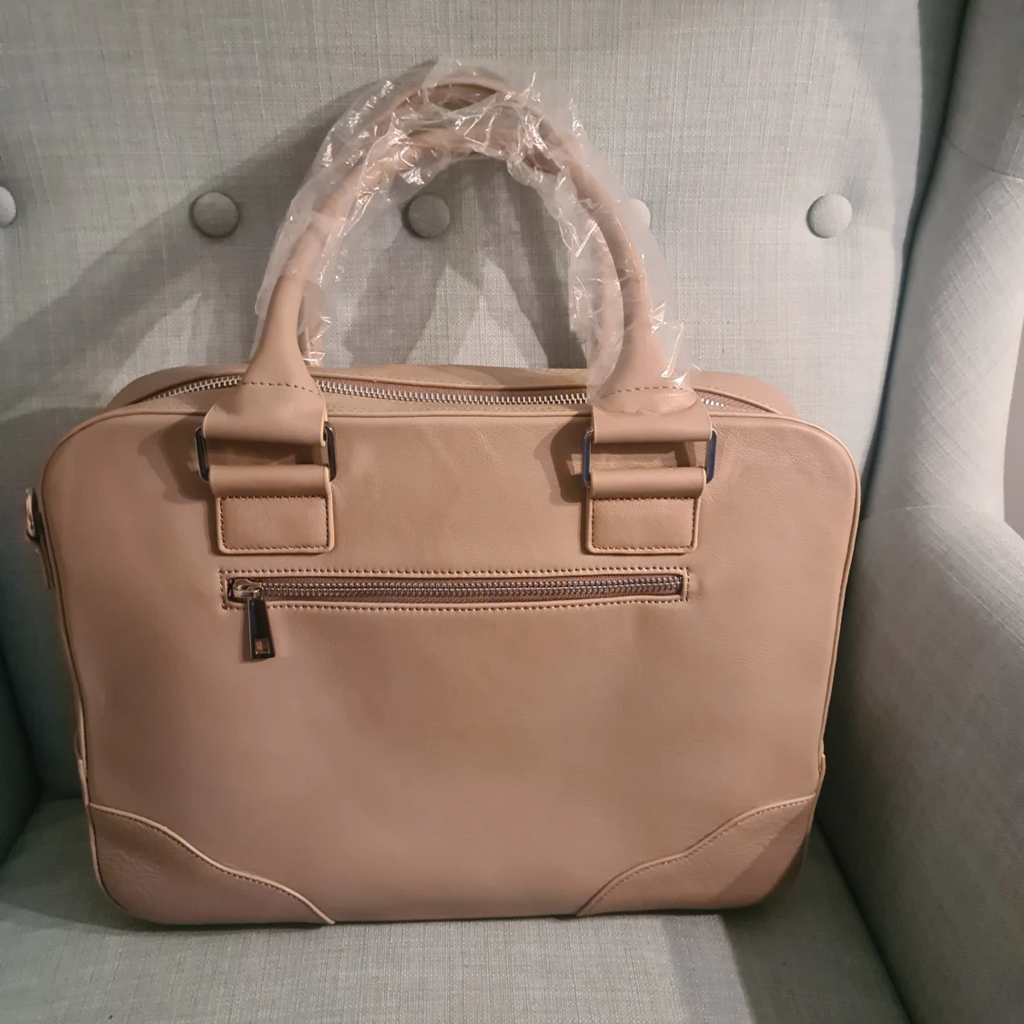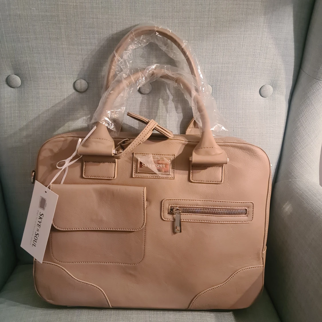 Stilren greige datorväska från Sky & Soul i läder. Väskan har flera fack, både med dragkedja och lock, samt praktiska handtag. Perfekt för att bära laptop och tillbehör. Enkel, modern design med diskreta detaljer och avtagbar tagg. Finns även axelrem för att bära over the shoulder. Helt ny.