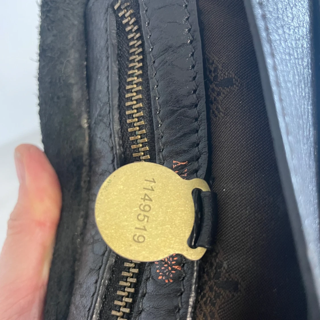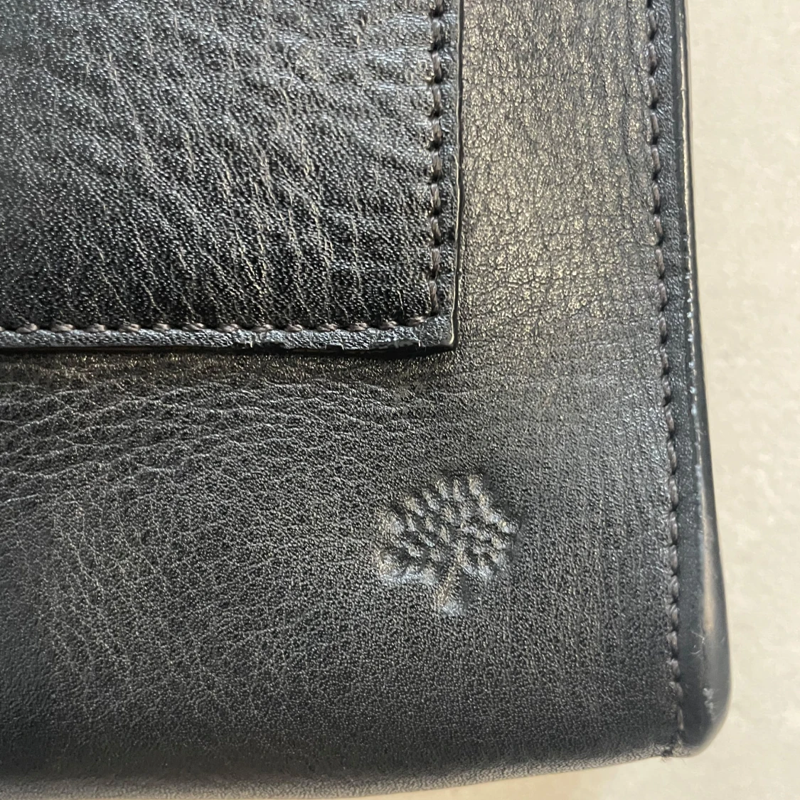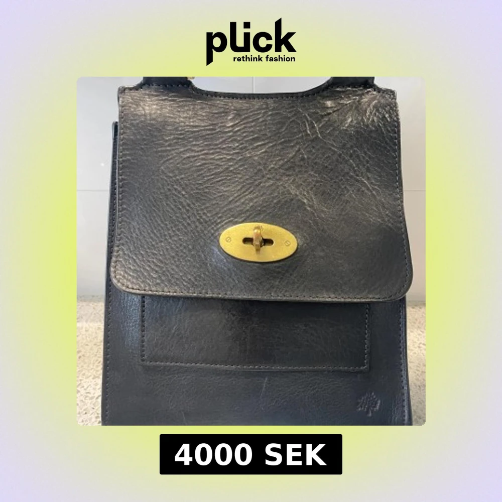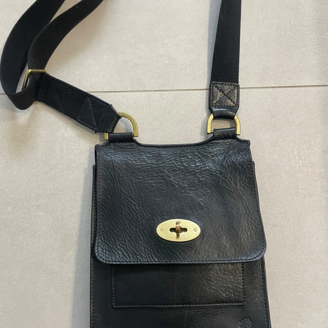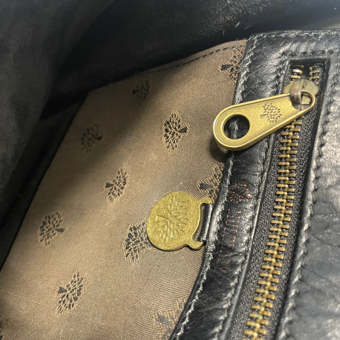 Säljer en klassisk svart axelväska från Mulberry i äkta skinn. Väskan har ett lock med guldfärgat vridlås och justerbar axelrem. Invändigt finns ett fack med dragkedja och typisk Mulberry-foder med logga.