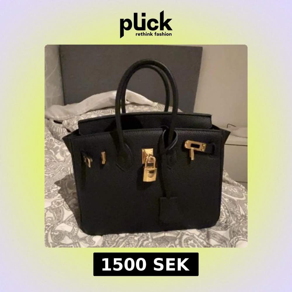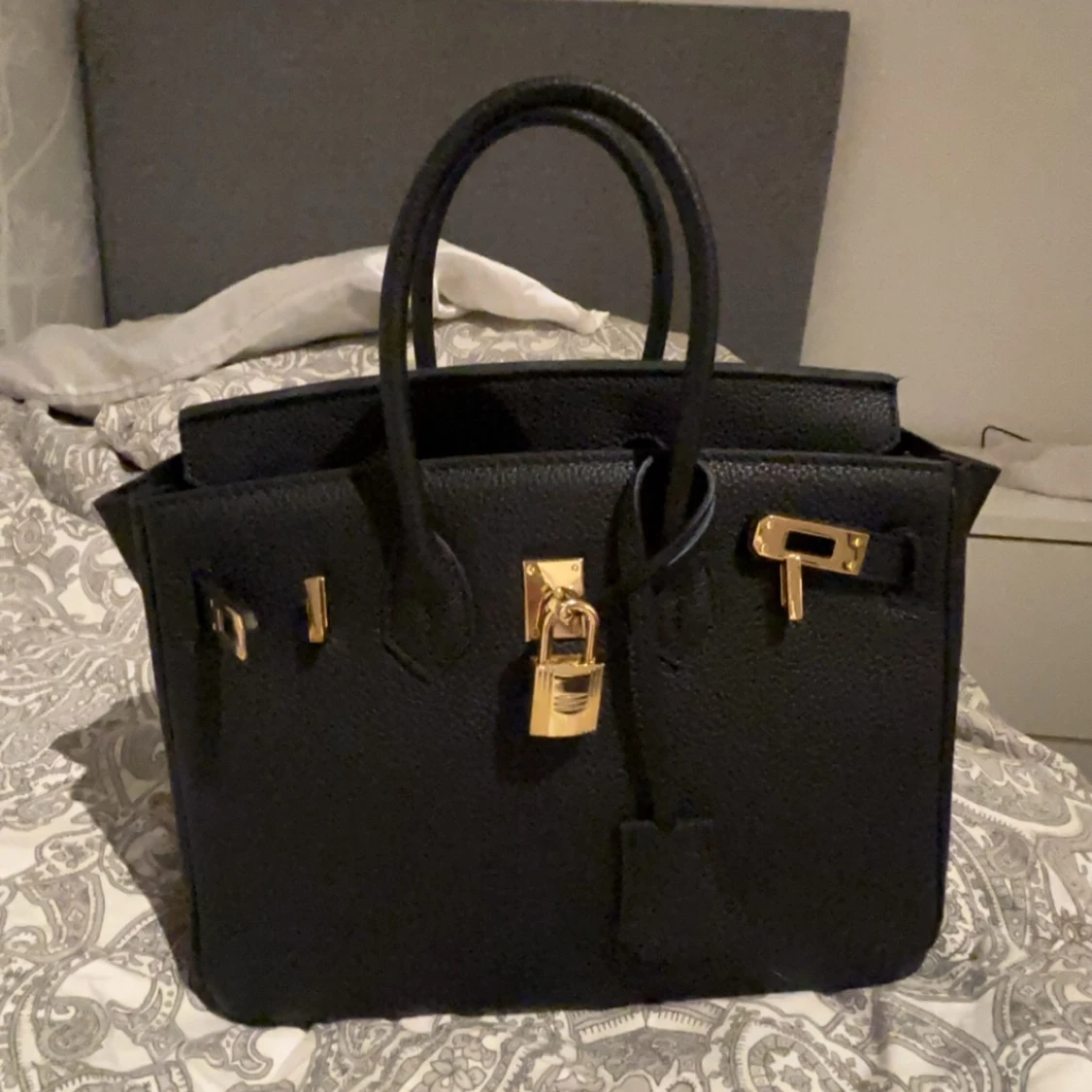 Elegant svart handväska med gulddetaljer och lås. Perfekt för att ge en lyxig touch till din outfit. Väskan har en klassisk design med två handtag och en strukturerad form.