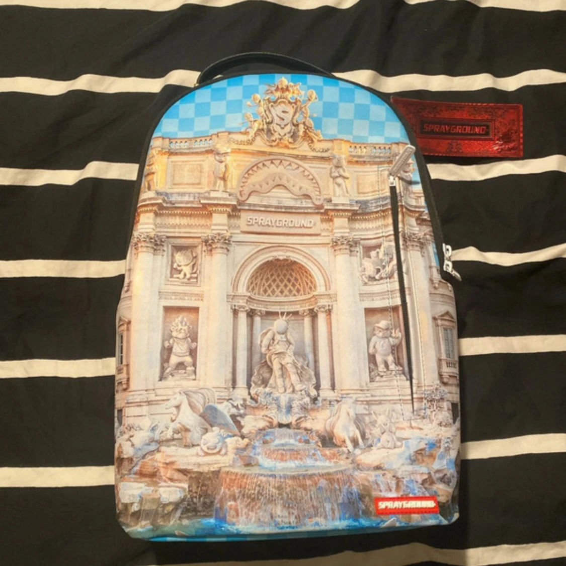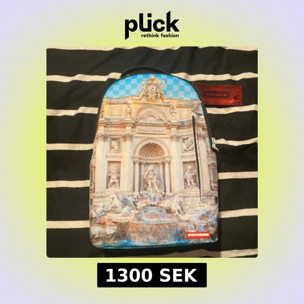 Limited edition ryggsäck från Sprayground med ett detaljerat tryck av en klassisk fontän och blått rutmönster upptill. Väskan har svarta axelremmar och insida med röd etikett. Materialet är syntet och polyester, perfekt för dig som vill sticka ut.