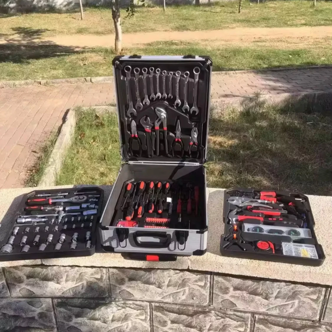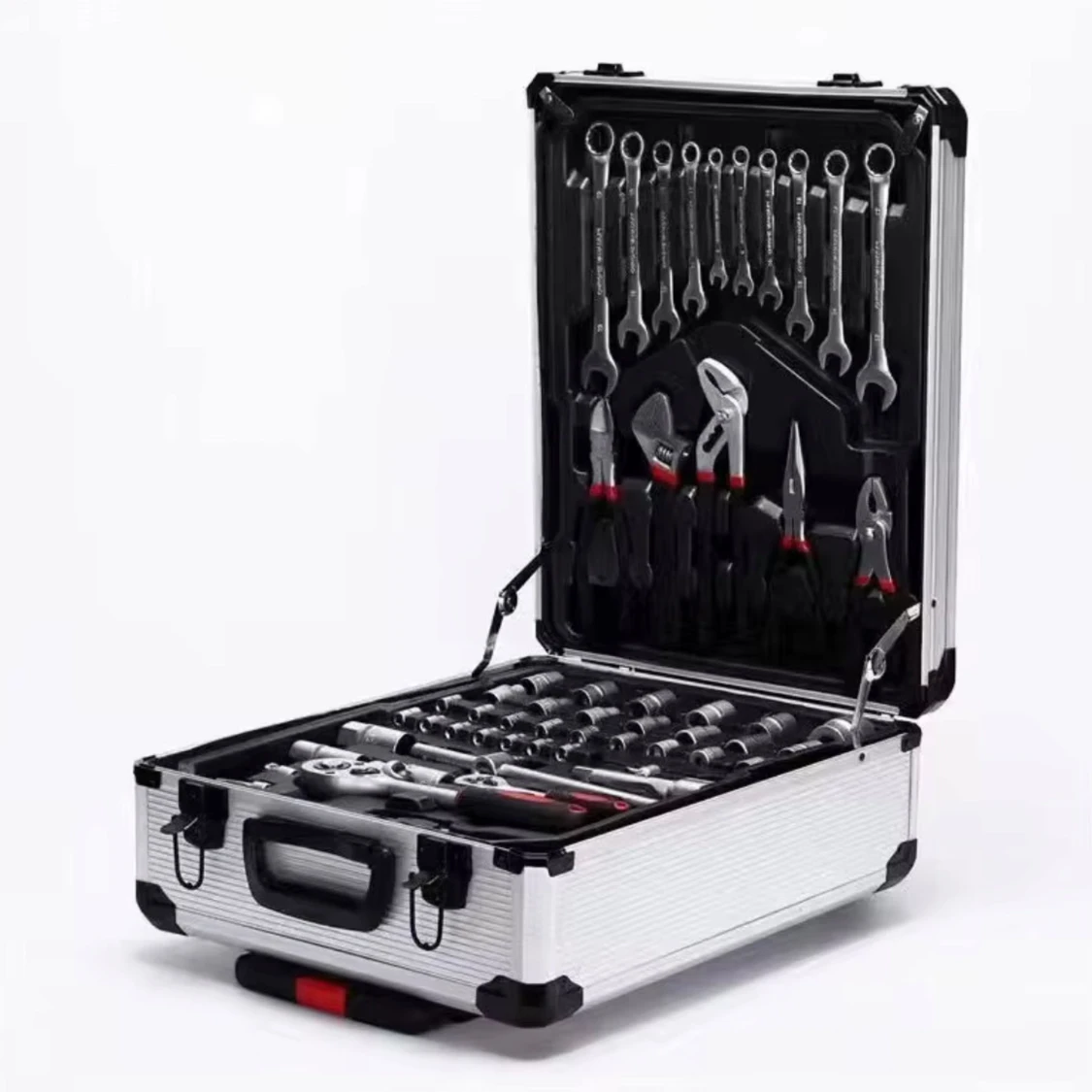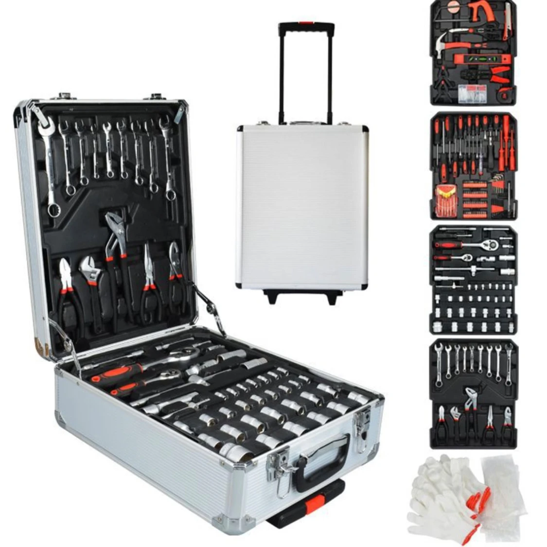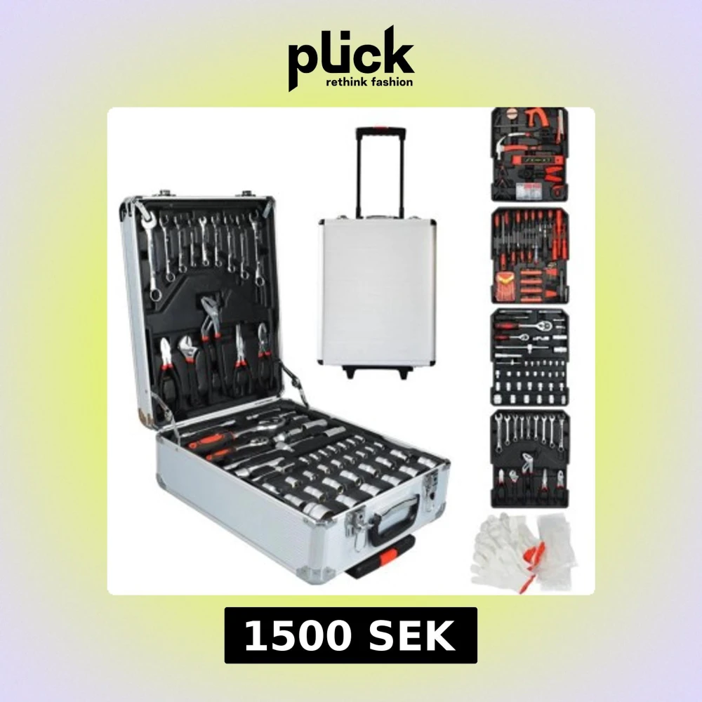 Praktisk verktygsväska i silver med svart handtag och hjul. Väskan innehåller ett stort urval av verktyg som skiftnycklar, tänger, skruvmejslar och hylsnycklar. Perfekt för dig som vill ha allt samlat på ett ställe.