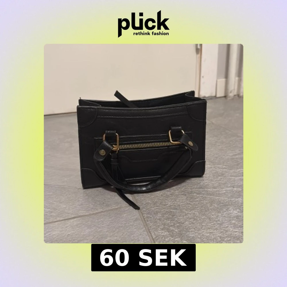 Stilren svart handväska i skinnimitation med rektangulär form och snygga guldfärgade metalldetaljer. Väskan har praktiskt handtag och en dragkedja framtill för extra förvaring. Perfekt storlek för det viktigaste och ger en cool vibe till din outfit.