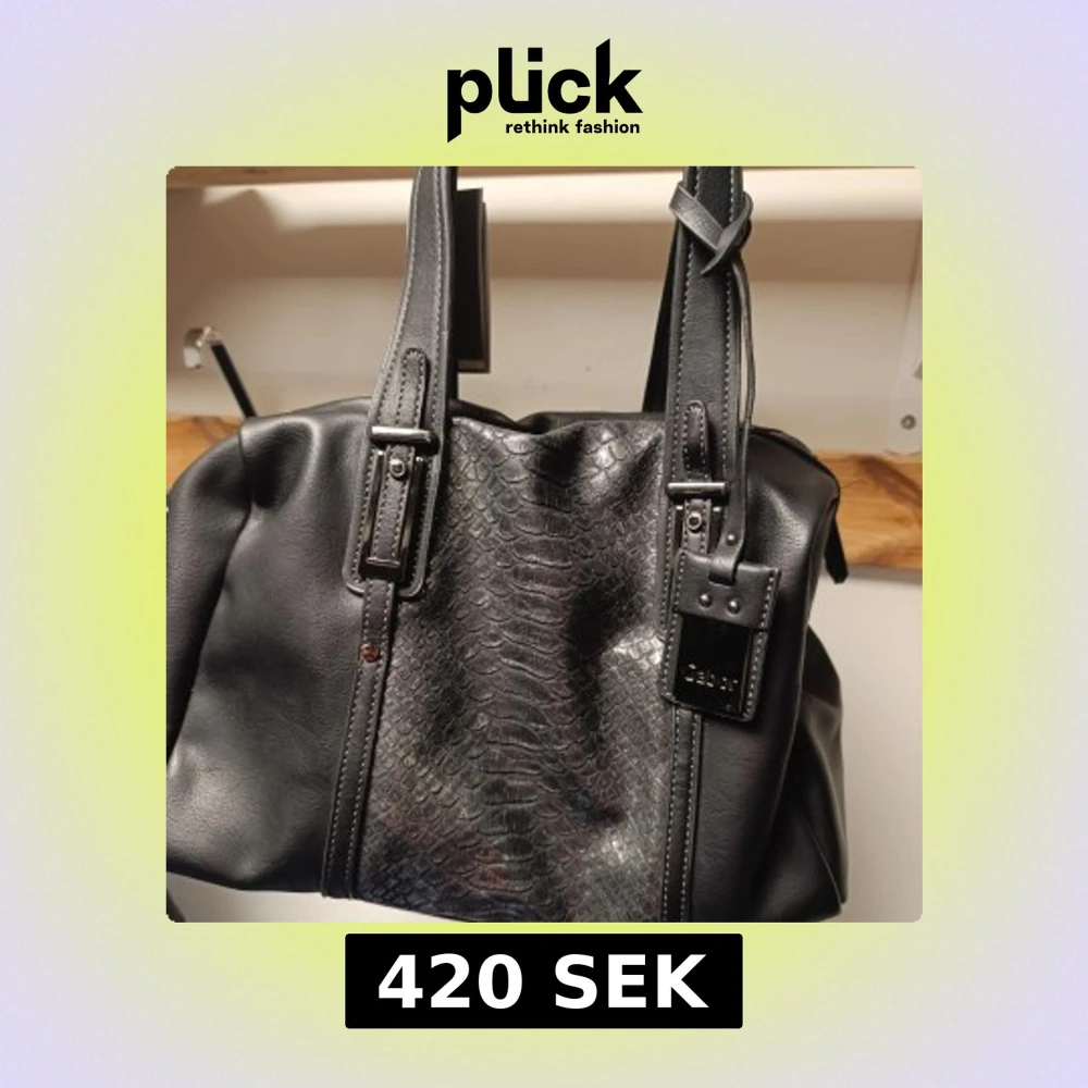 Snygg svart handväska från Gabor med coolt ormskinnsmönster på framsidan och detaljer i silver. Väskan har dubbla handtag, dragkedja bak och ett rymligt mönstrat innerfoder. Perfekt för dig som vill ha en stilren men ändå unik väska.