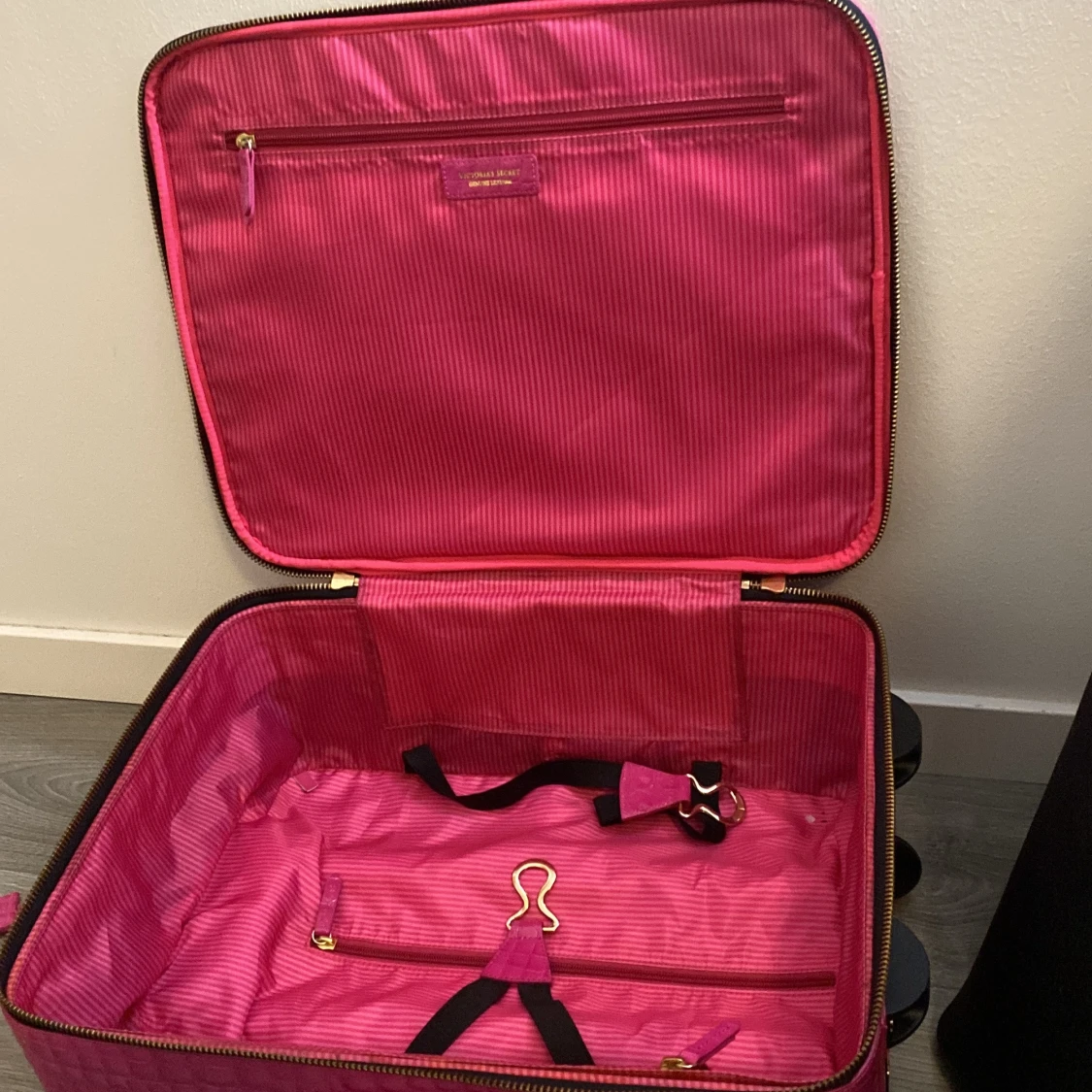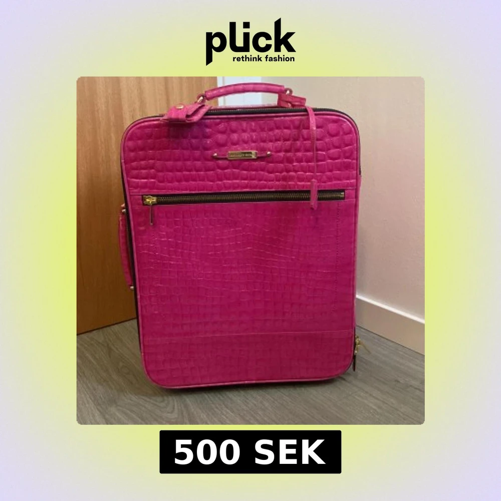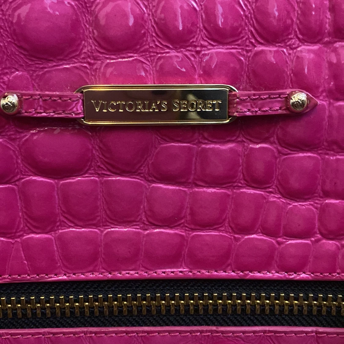 Snygg rosa resväska från Victoria's Secret med krokodilpräglat mönster. Väskan har en praktisk dragkedja och hjul för enkel transport. Insidan är fodrad med rosa randigt tyg och har remmar för att hålla dina saker på plats. Perfekt för resan!