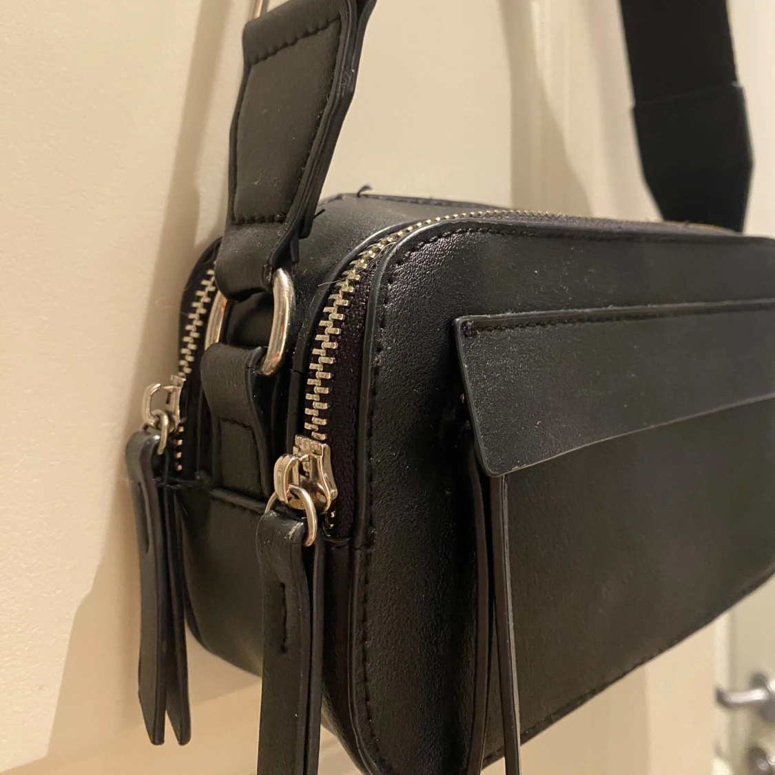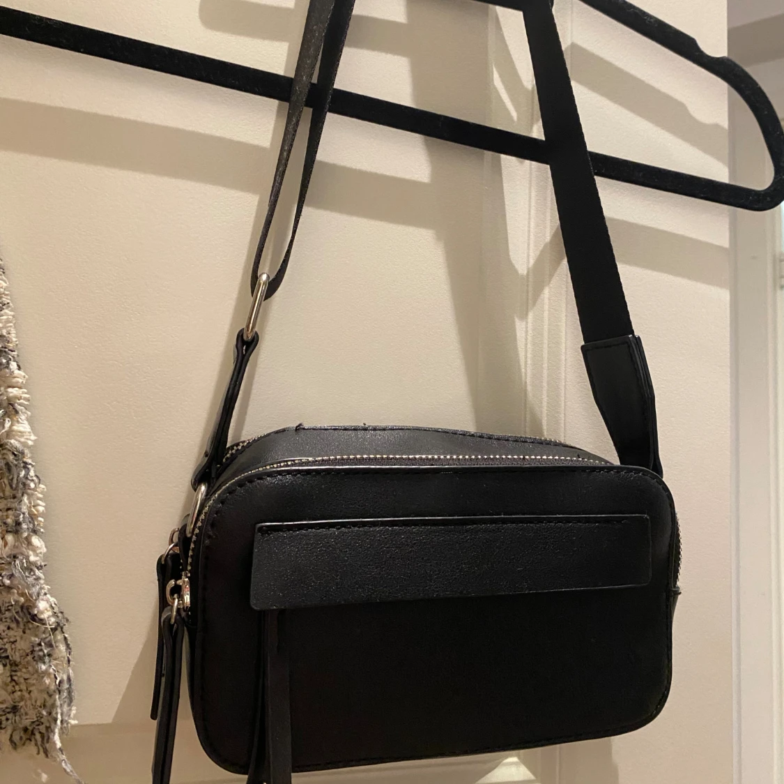 Snygg svart axelväska i skinn med justerbart axelband och dubbla dragkedjor. Perfekt för att bära det viktigaste och passar till många olika outfits.💕💕💕