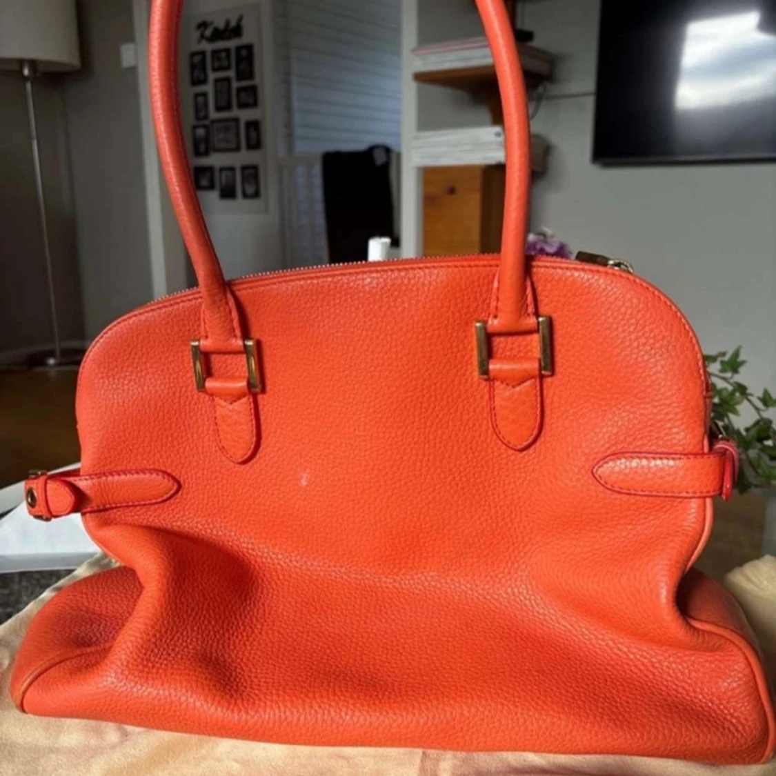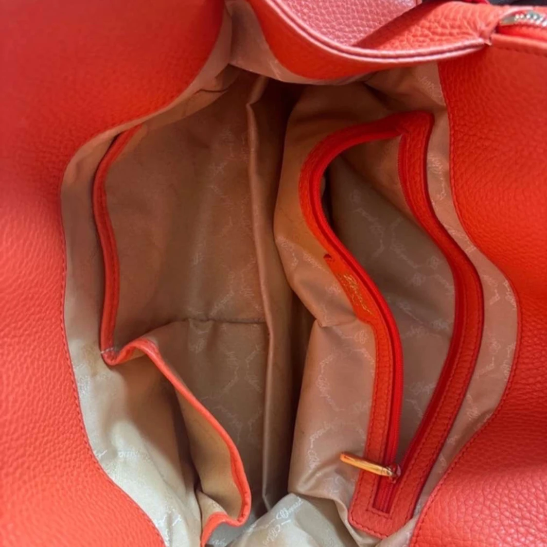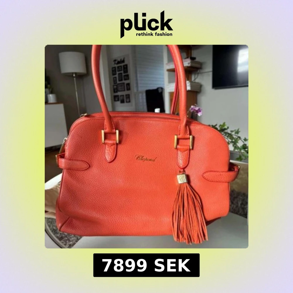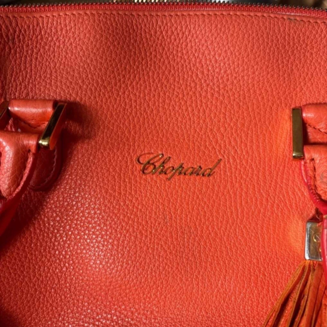 Snygg orange handväska från Chopard i skinn med gulddetaljer och en dekorativ frans. Väskan har två handtag och en dragkedja upptill. Väskan är väldigt exklusiv och därför är varan väldigt dyr. Bilderna är väldigt suddiga men om du är intresserad kan jag ta nya bilder och skicka till dig