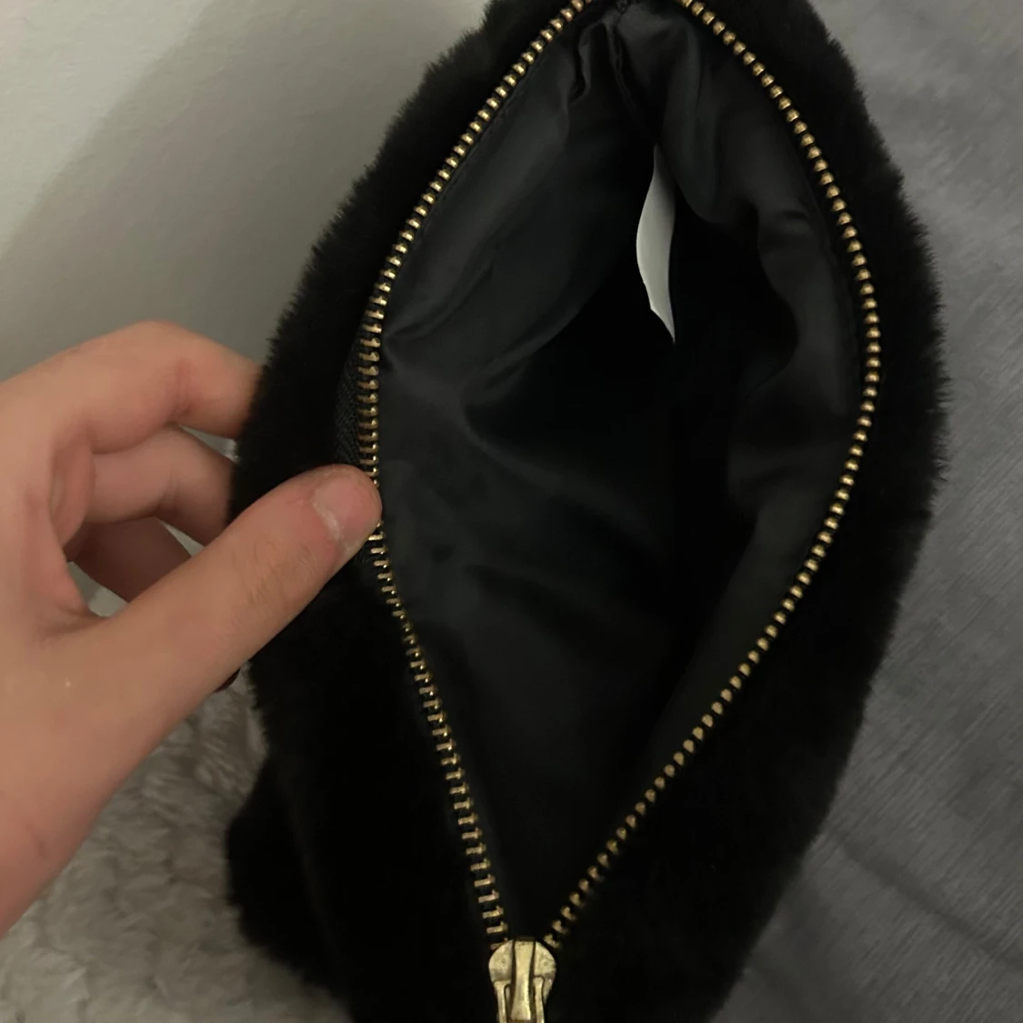 Snygg och mjuk svart pälsväska med dragkedja. Skönt att ha i väskan till smink osv oanvänd💕