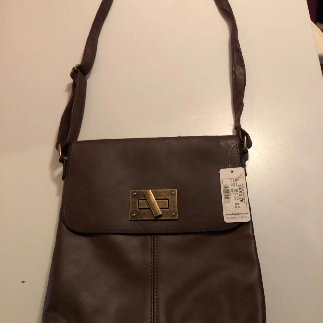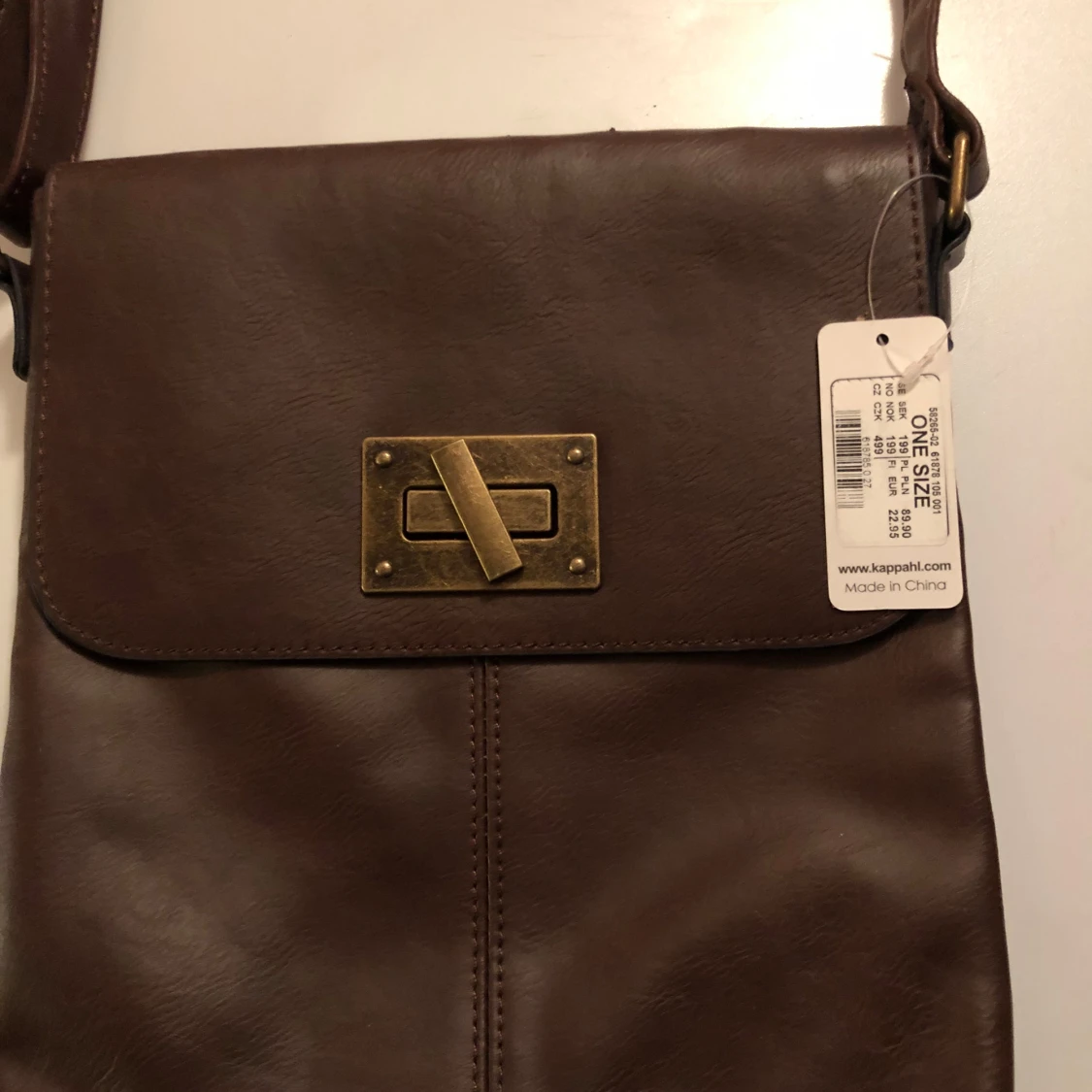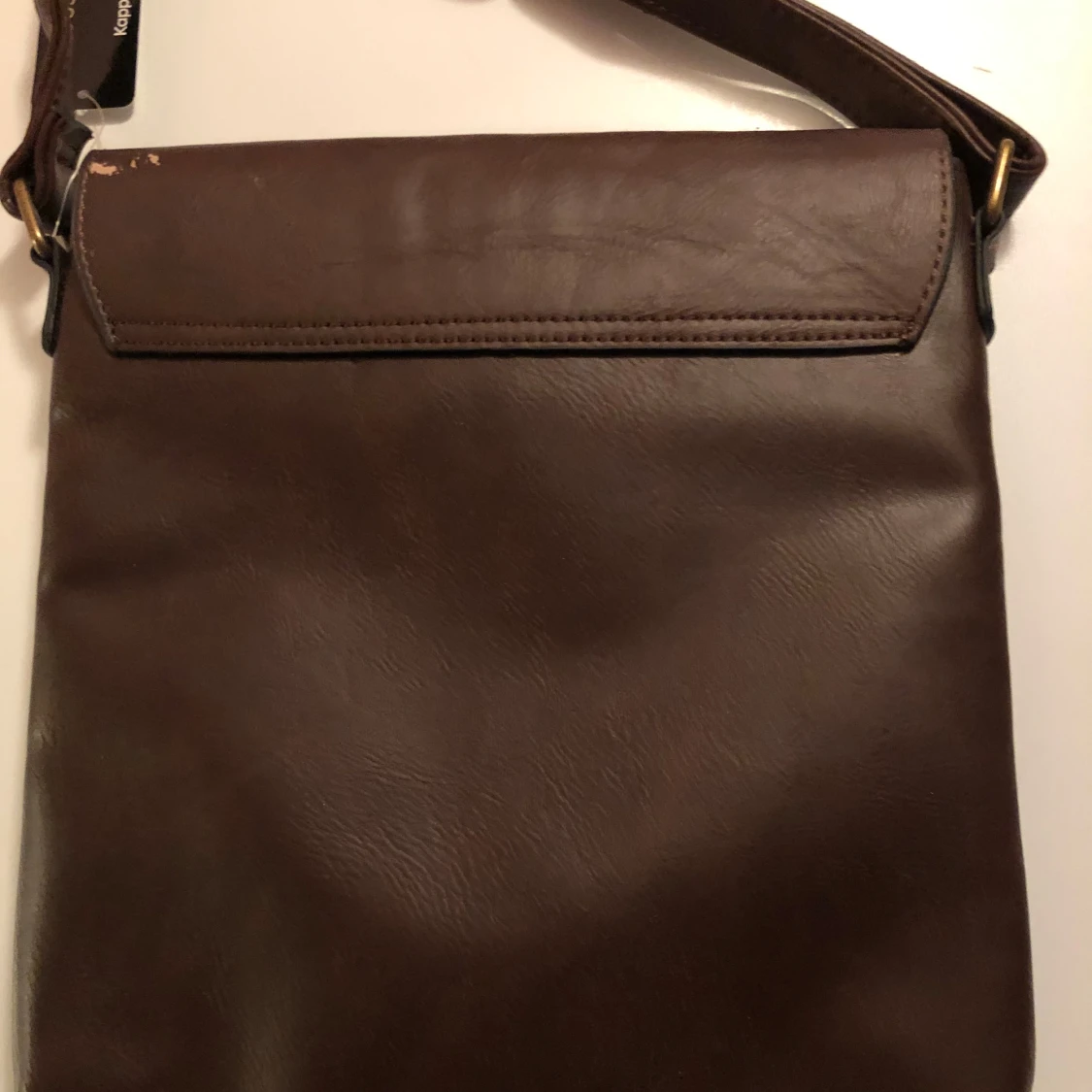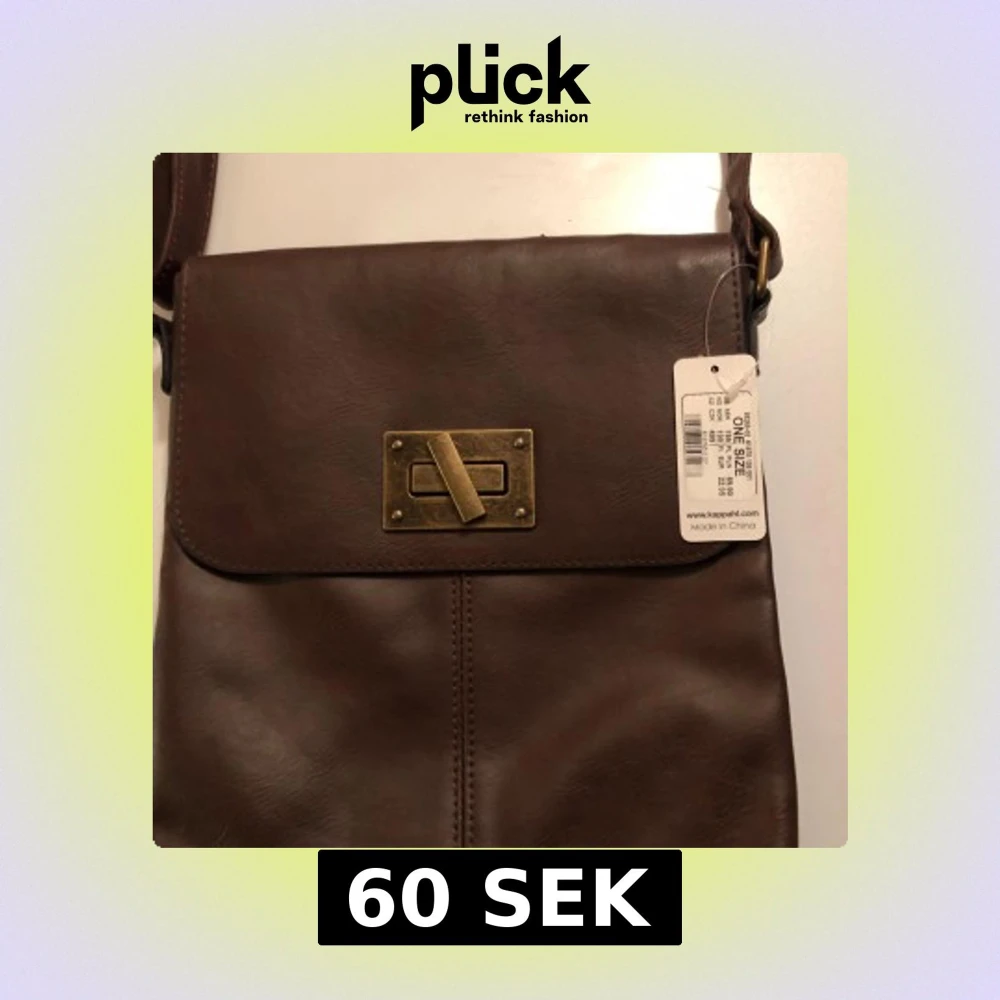 Snygg brun axelväska i syntetmaterial med ett stilrent metallspänne framtill. Väskan har en justerbar axelrem och en praktisk storlek för vardagsbruk. Perfekt för att bära med sig det nödvändigaste.