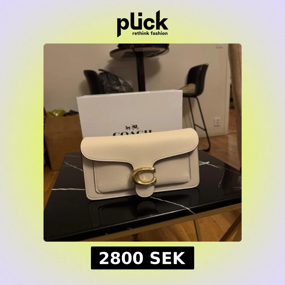 Stilren beige kuvertväska från Coach med exklusiv känsla. Väskan har en stor guldfärgad C-detalj på framsidan och är tillverkad i strukturerat skinn. Perfekt storlek för det viktigaste och levereras med originalbox.