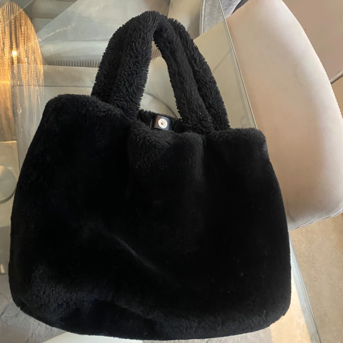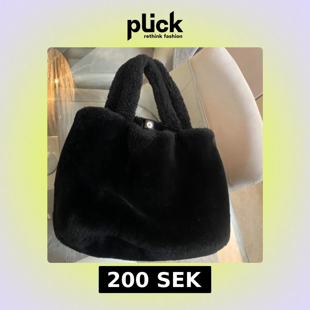 Säljer en svart fluffig handväska med mjukt pälsliknande material och två rejäla handtag. Perfekt för dig som vill ha en mysig och trendig accessoar till din outfit.