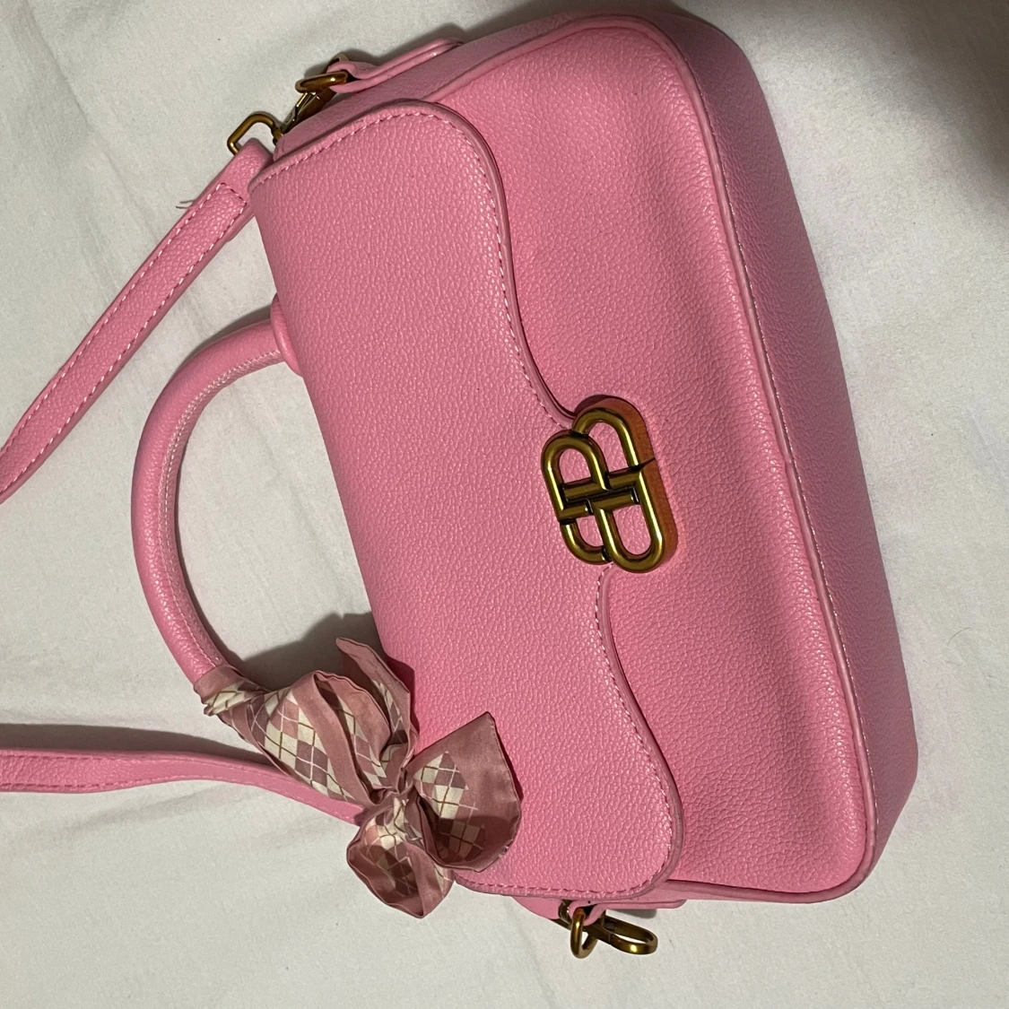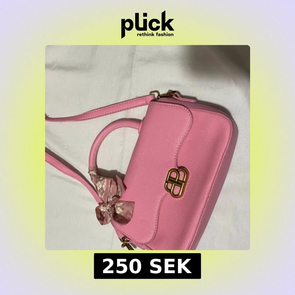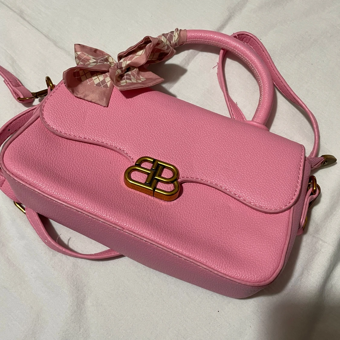 Snygg rosa axelväska i syntetmaterial med ett elegant guldfärgat spänne. Väskan har en söt rosett knuten runt handtaget och en justerbar axelrem. Perfekt för att ge en färgklick till din outfit!