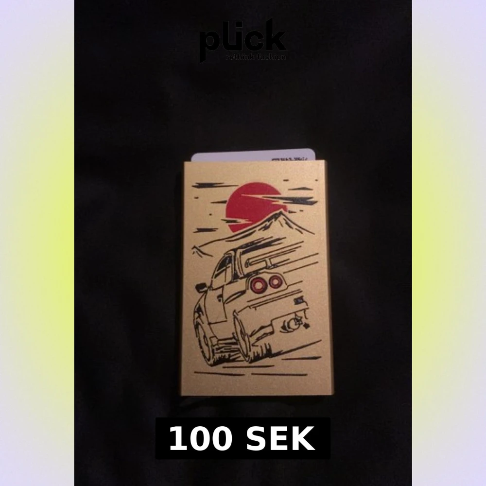 Slimmad gul plånbok i metall med ett coolt tryck av en sportbil och röd sol mot berg i bakgrunden. Perfekt för kort och sedlar, lätt att bära i fickan. Snygg design som sticker ut och passar dig som gillar bilar och unik stil.