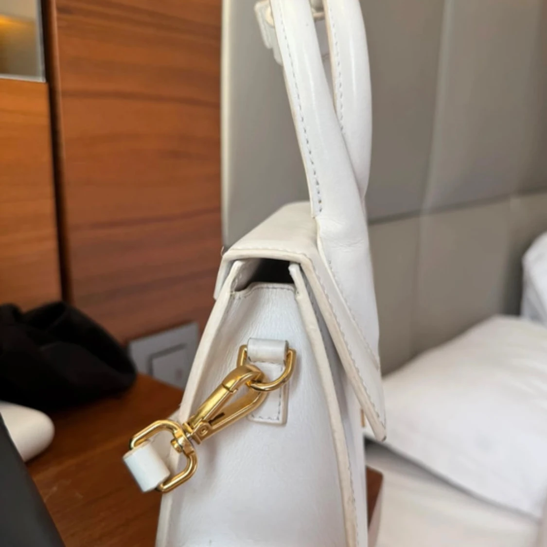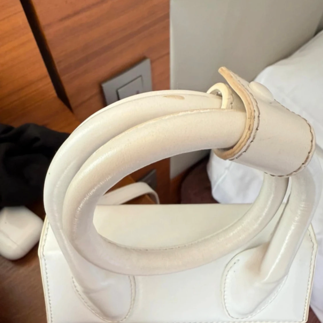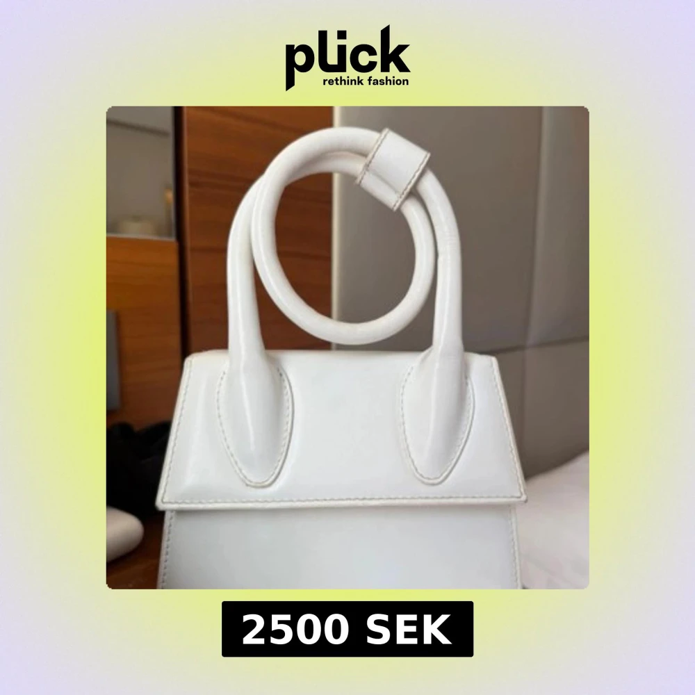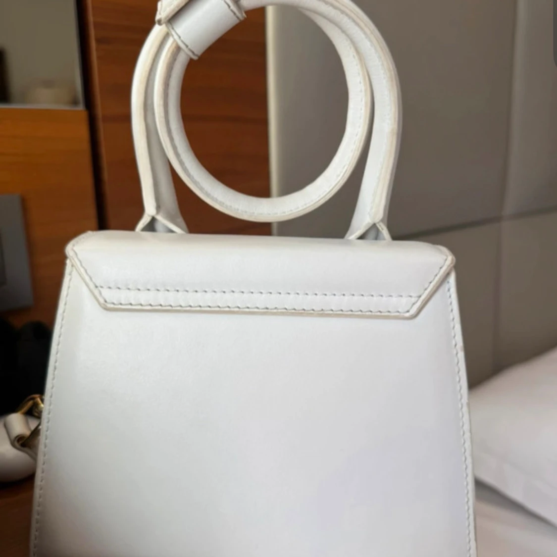 Säljer en stilren vit handväska med unikt rundat handtag och guldfärgade metalldetaljer. Väskan har en minimalistisk design med slät yta och är tillverkad i skinn. Perfekt för dig som gillar trendiga accessoarer med en twist.