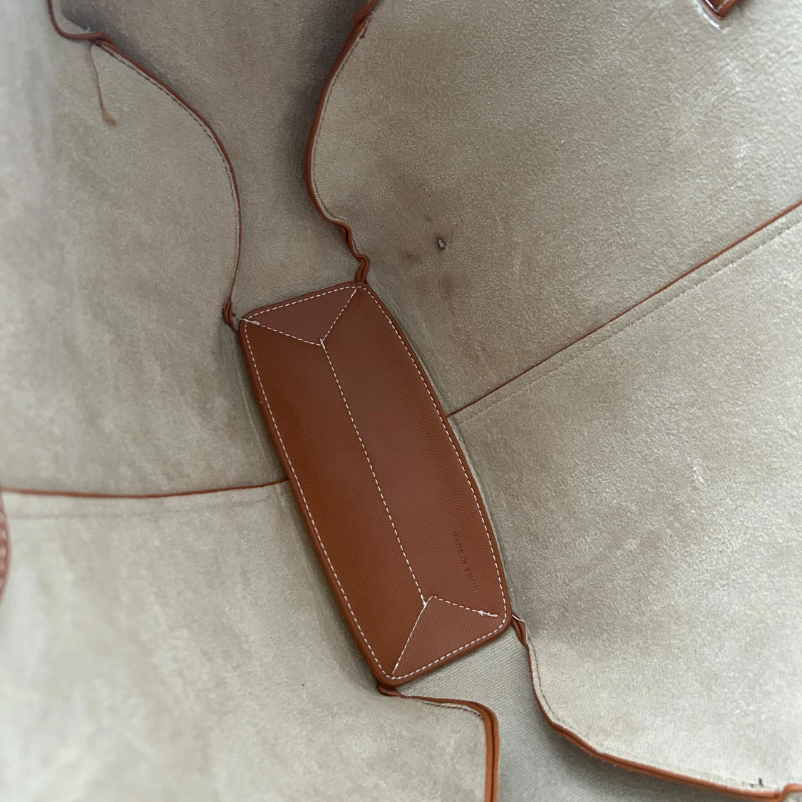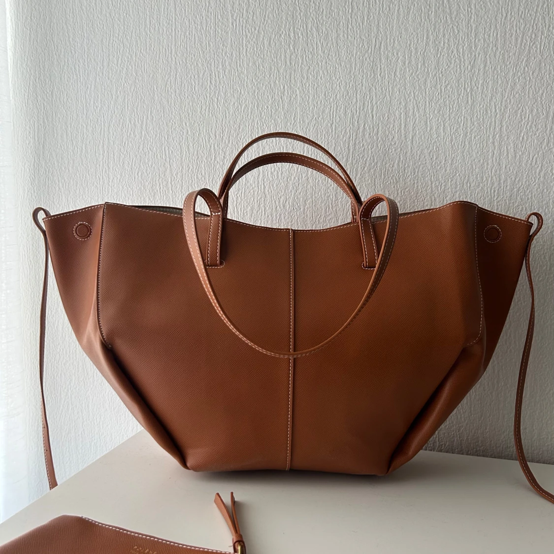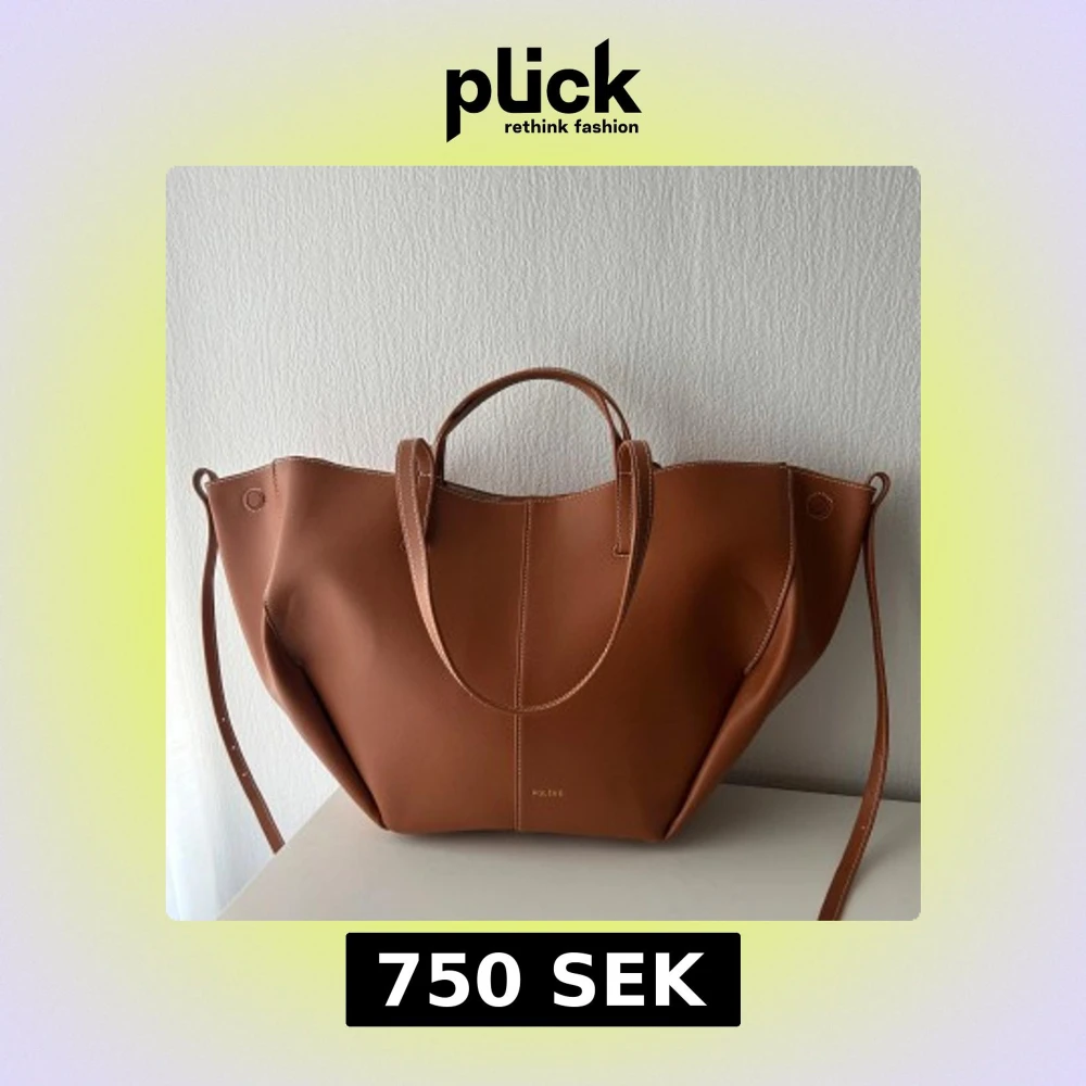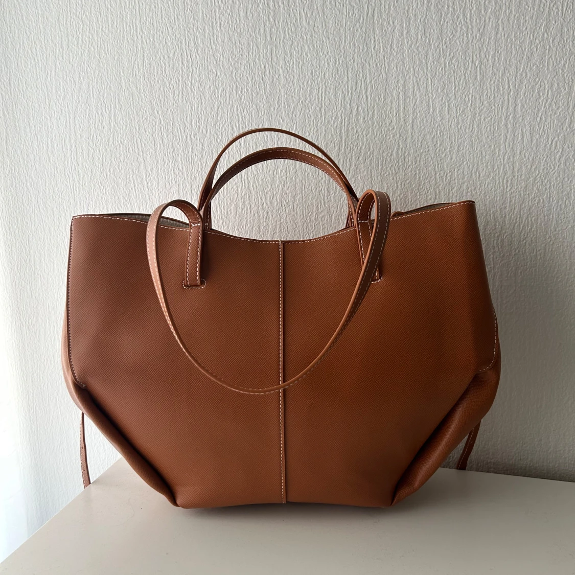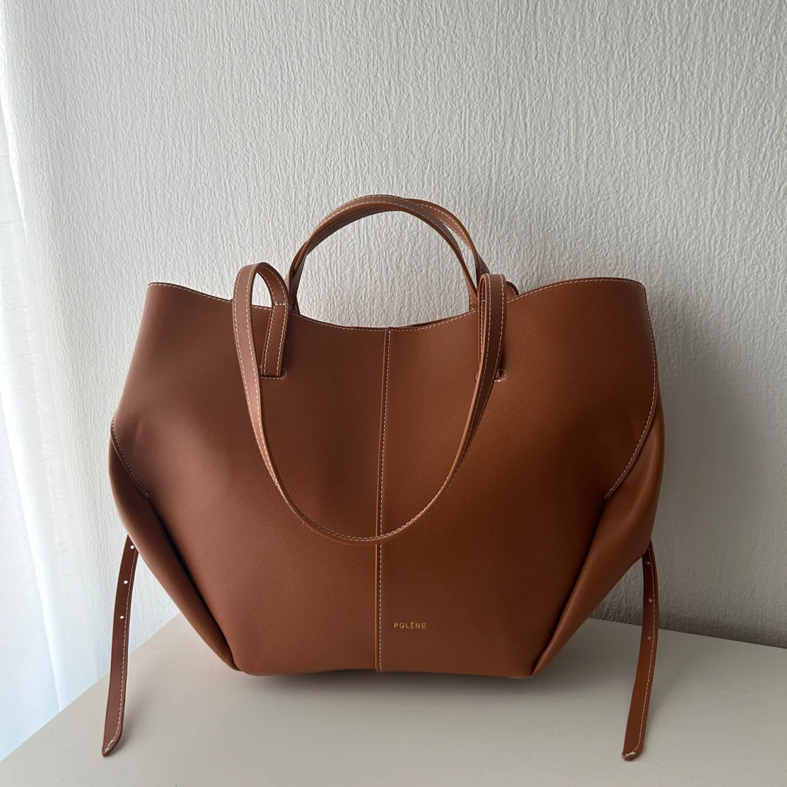 Säljer min bruna tote bag, Polène-inspirerad (ej äkta), då den inte riktigt passade min stil. Väskan är rymlig och praktisk, perfekt för skolan eller vardagliga ärenden. Får plats med böcker, anteckningsblock, dator och andra nödvändigheter. Det finns en liten defekt inuti väskan, som syns på sista bilden.