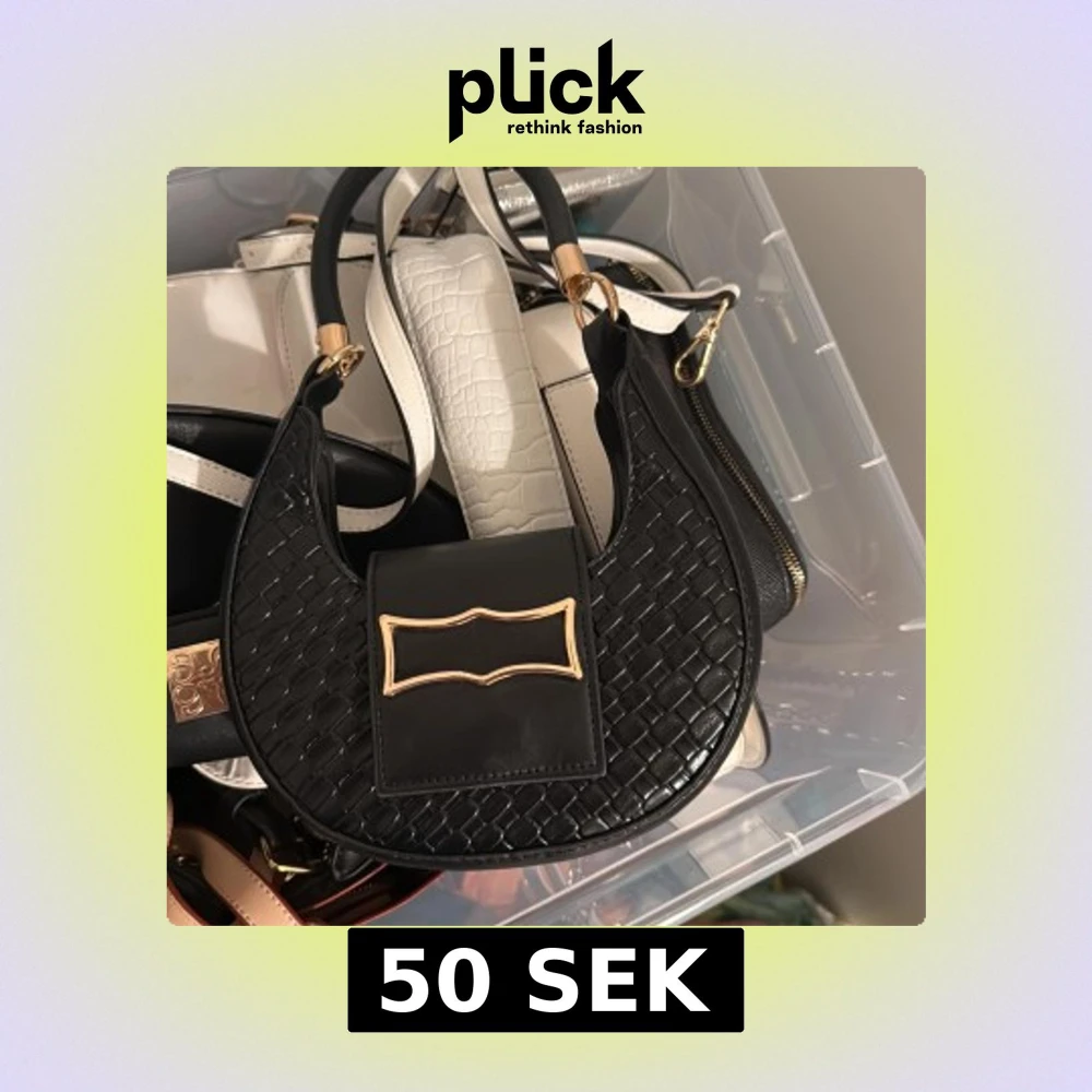 Snygg svart handväska med flätad struktur och unik guld-detalj på framsidan. Väskan har en rundad form och ett stadigt handtag med guldfärgade metalldelar. Perfekt för dig som vill ha en stilren och trendig accessoar.