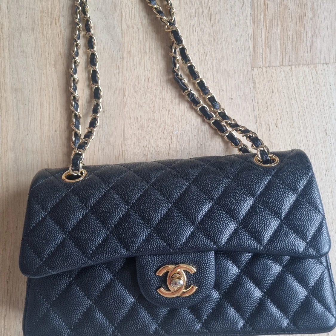 Supersnygg svart axelväska med klassiskt quiltat mönster och guldfärgade detaljer. Väskan har en ikonisk kedjerem med logga fram i vredet. Perfekt storlek för det viktigaste och en riktig statement piece. Köpt för 7000:- helt oanvänd.