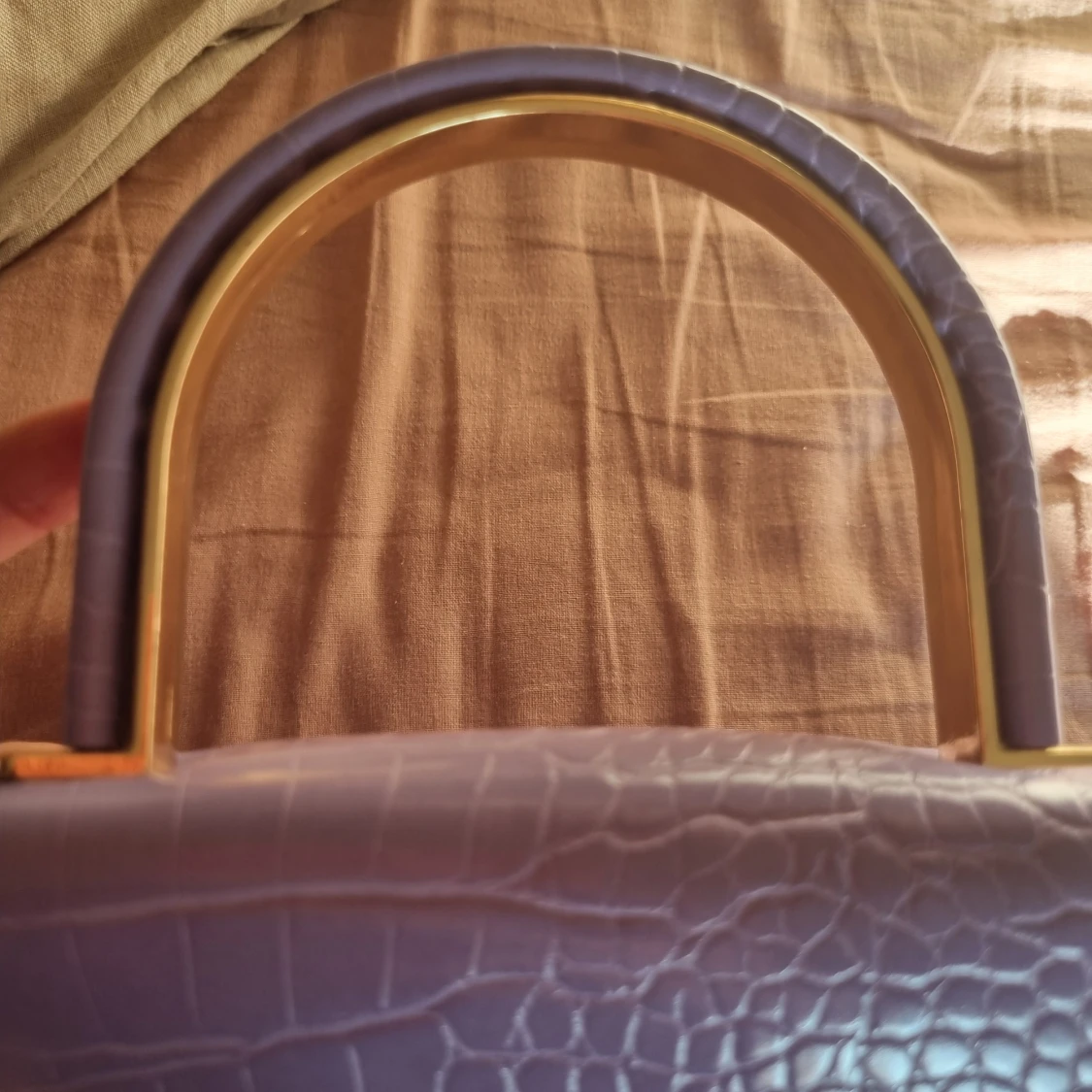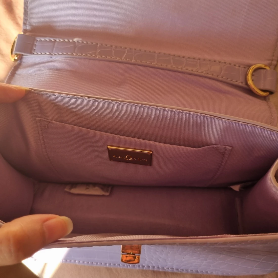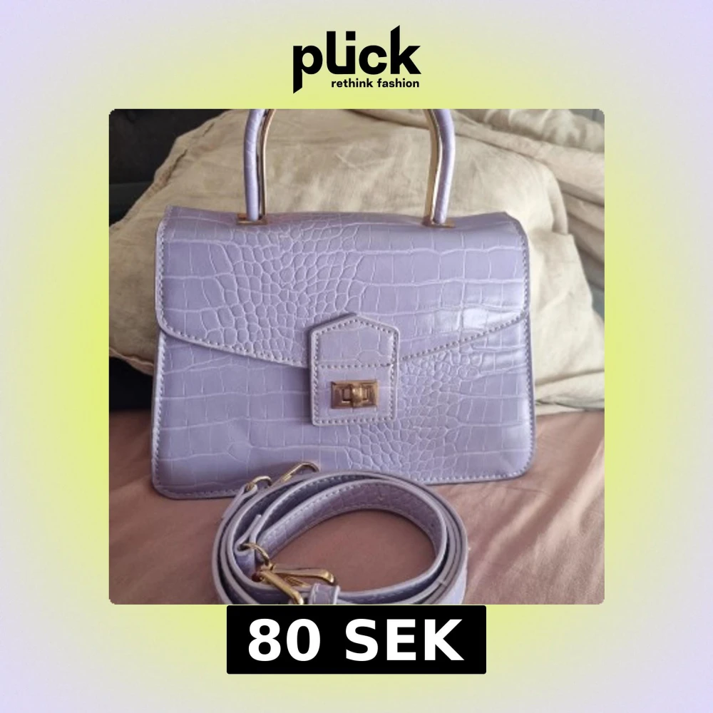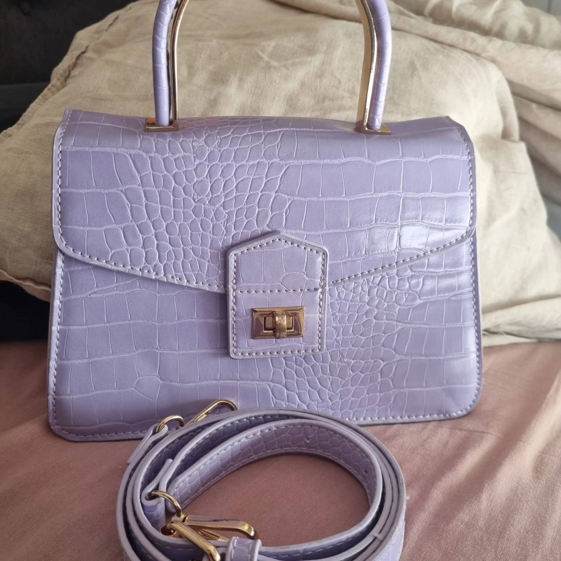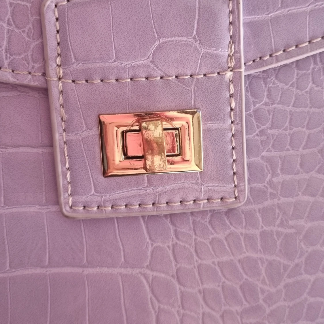 Säljer en super gullig ljuslila handväska från Bijou Brigitte i croco-imitation med guldfärgade detaljer och vridlås. Väskan har ett metallhandtag och avtagbar axelrem. Väskan har tecken på användning men har varit väl omhändertagen. Storlek 23 x 5 x 17cm