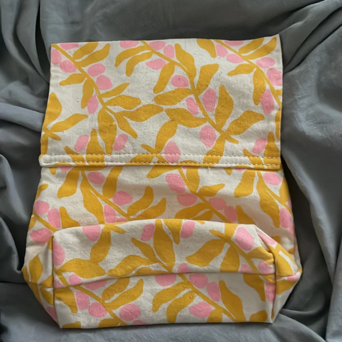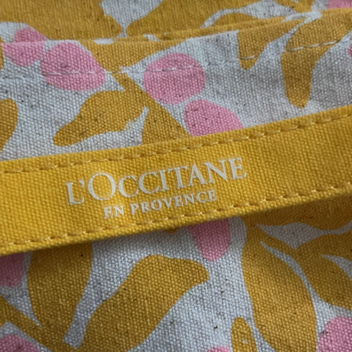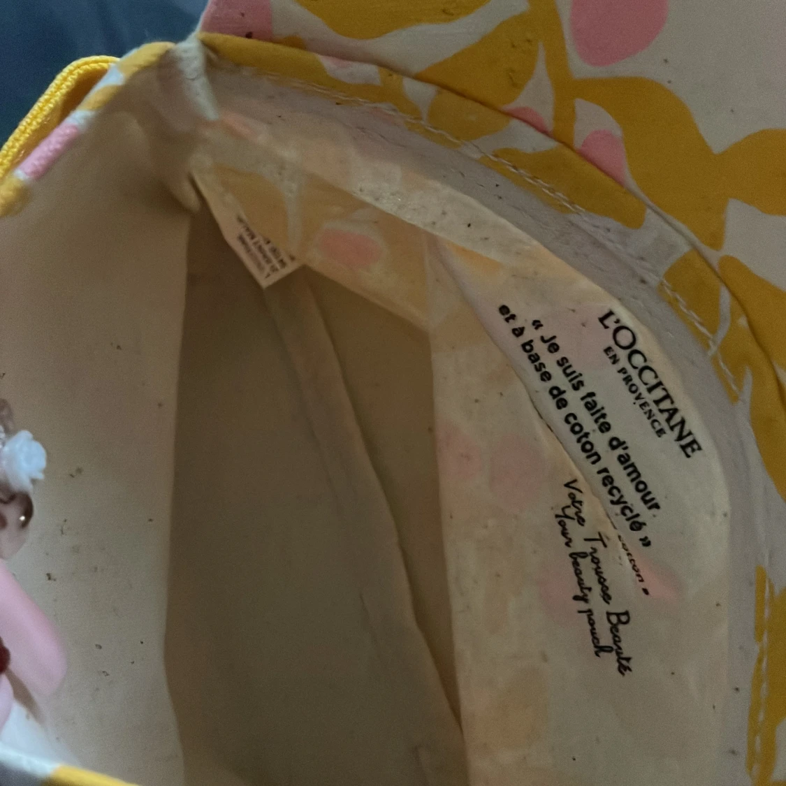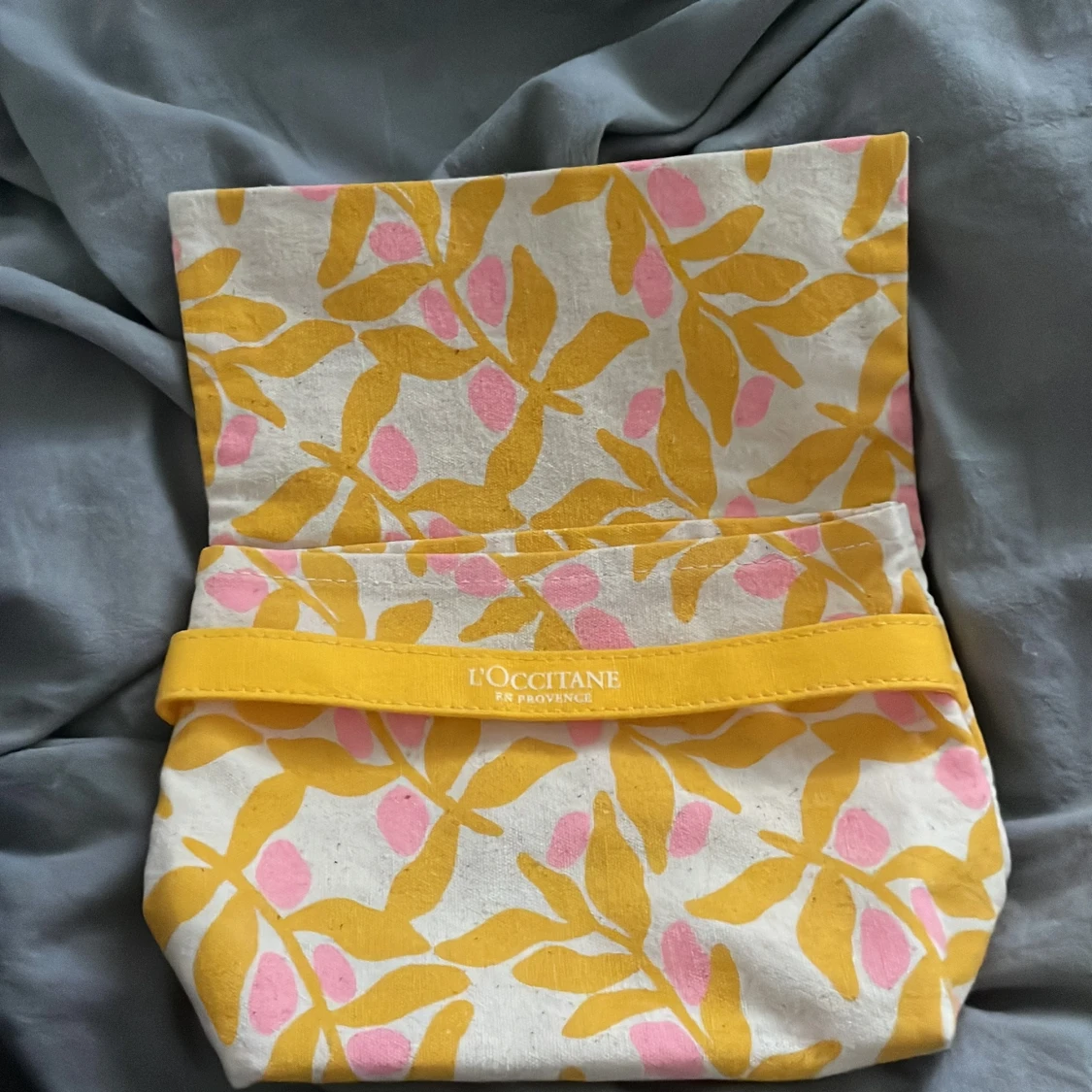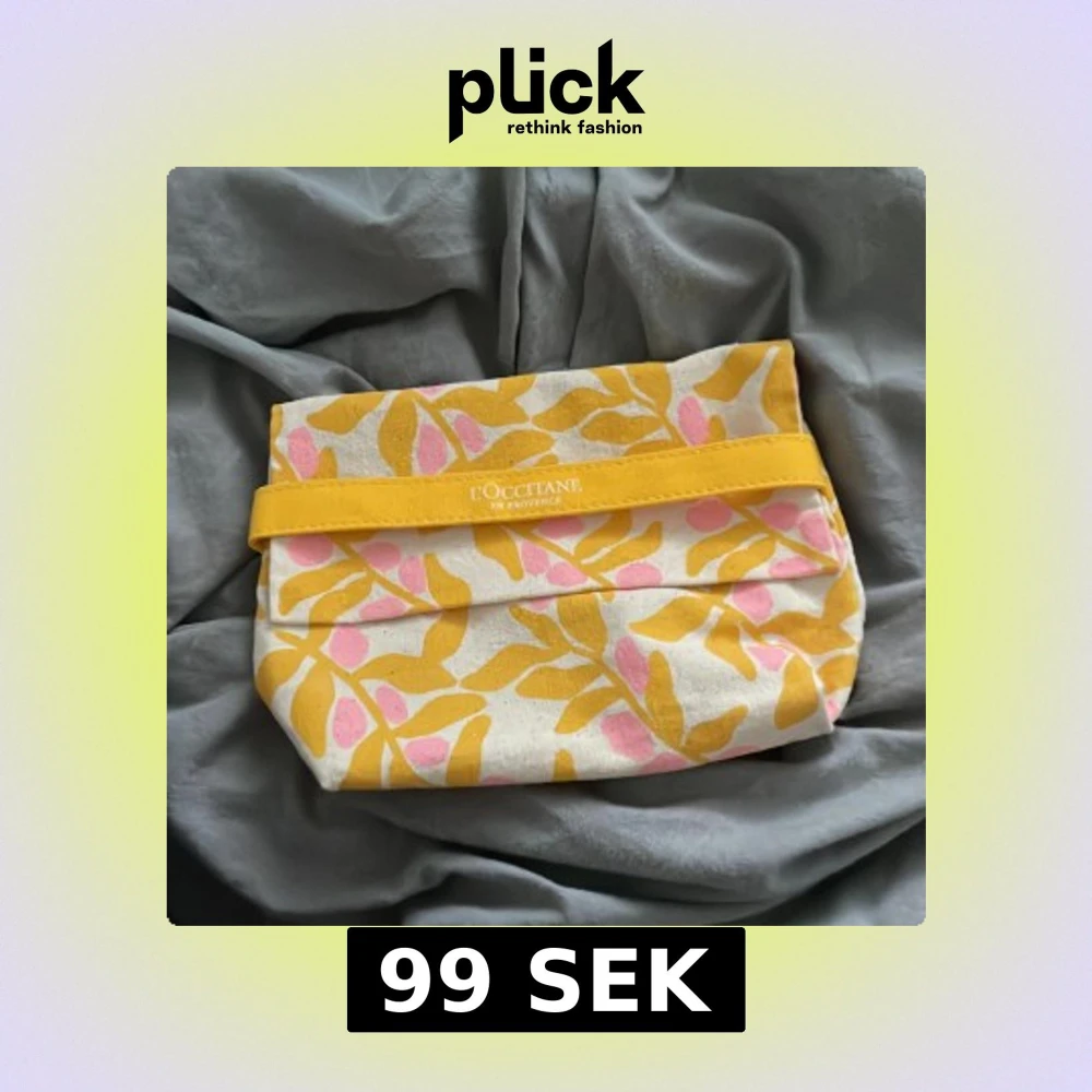 Necessär från L'Occitane i beige bomullstyg med gult och rosa bladmönster. Väskan har gul kant med logga och stängs med ett lock som viks ner. Perfekt för att förvara smink eller småsaker.