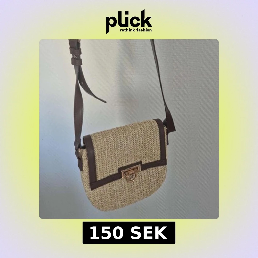 Snygg beige axelväska med bruna läderdetaljer och ett elegant spänne framtill. Väskan har en justerbar axelrem och är perfekt för att bära dina nödvändigheter med stil. Den har en flätad textur som ger en unik look.
