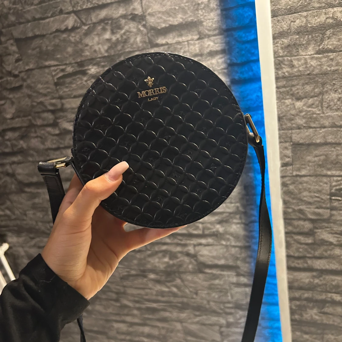 Säljer en svart rund axelväska från Morris Lady i skinn med snygg quiltad framsida och guldfärgade detaljer. Väskan har justerbar axelrem och stängs med dragkedja. Perfekt storlek för mobil, plånbok och nycklar.