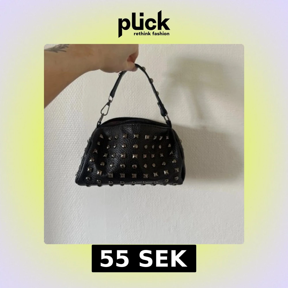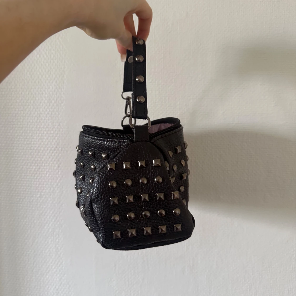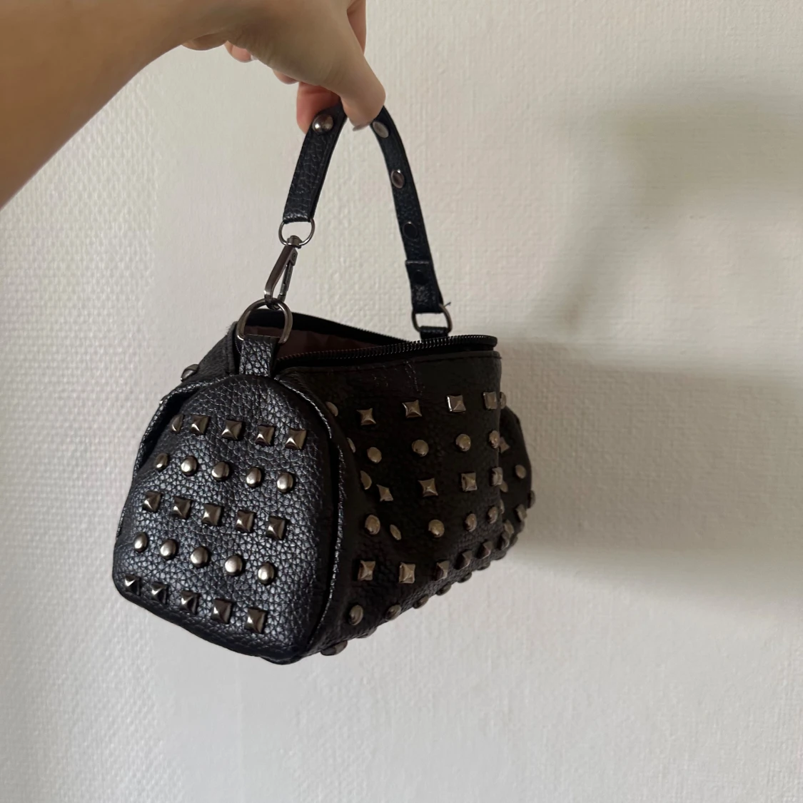 Cool svart handväska i skinnimitation med massor av silvriga nitar och studs över hela väskan. Väskan har ett kort handtag med extra nitar,dragkedja fungerar ej. Perfekt accessoar för en edgy look.