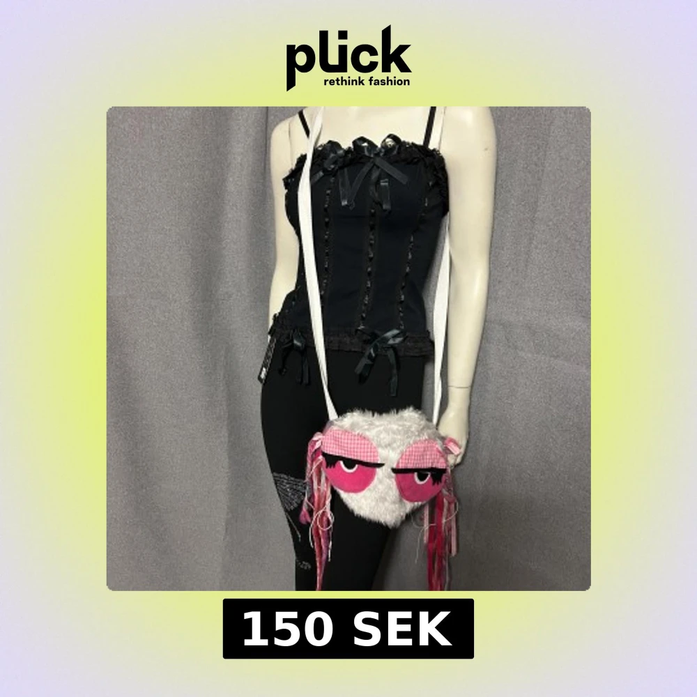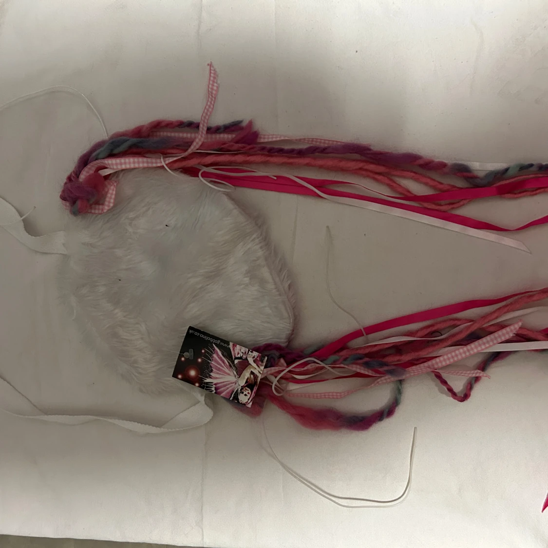 Supergullig axelväska i vitt fluffigt material med ett ugglemotiv i rosa och svart. Väskan har långa dekorativa band i rosa och rött samt ett justerbart axelband. Perfekt för dig som vill sticka ut med en unik accessoar!