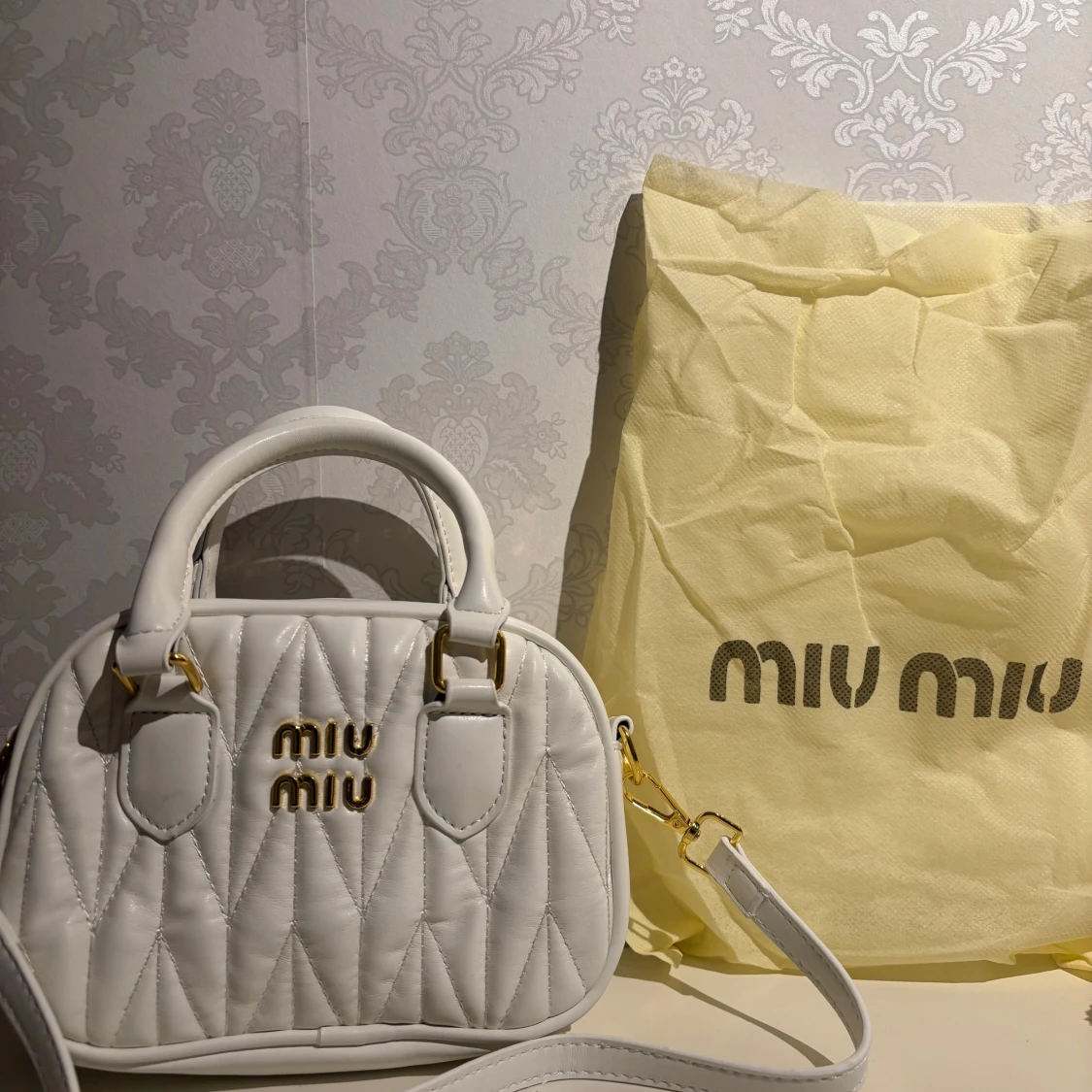 Supersnygg vit handväska från Miu Miu med quiltad design och guldfärgade detaljer. Väskan har både handtag och avtagbar axelrem, perfekt för att bära på olika sätt. Miu Miu-loggan i guld framtill ger en lyxig vibe. Kommer med original dustbag.