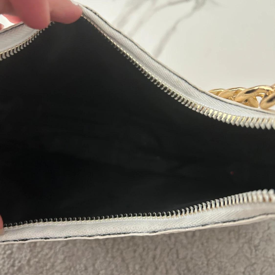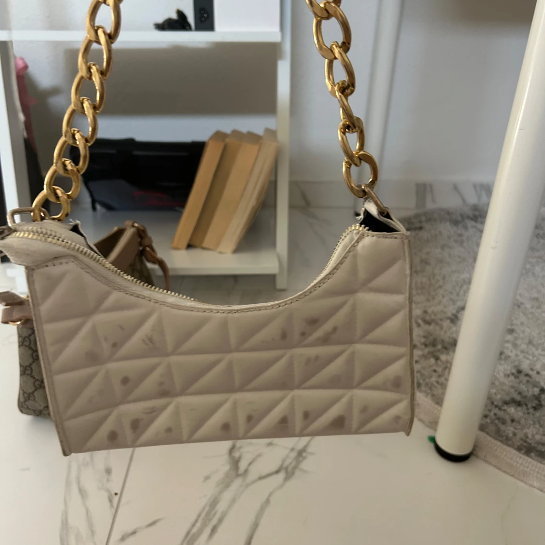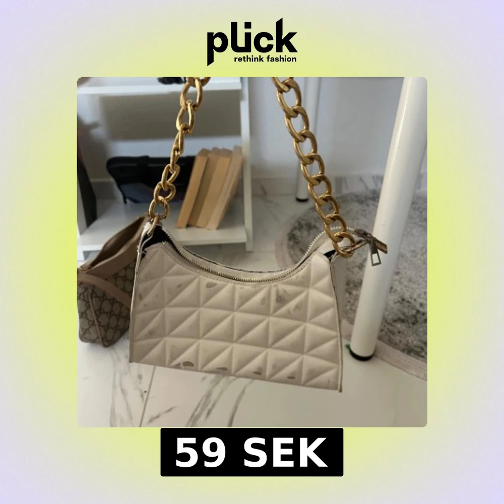 Snygg beige axelväska med quiltat mönster och en chunky guldfärgad kedja som axelrem. Väskan har en dragkedja upptill och en stilren, rektangulär form. Perfekt för att lyfta din outfit med en cool detalj. Väskan har fått svarta fläckar lite här och där vet inte om det går bort o tvättmaskinen 💕
