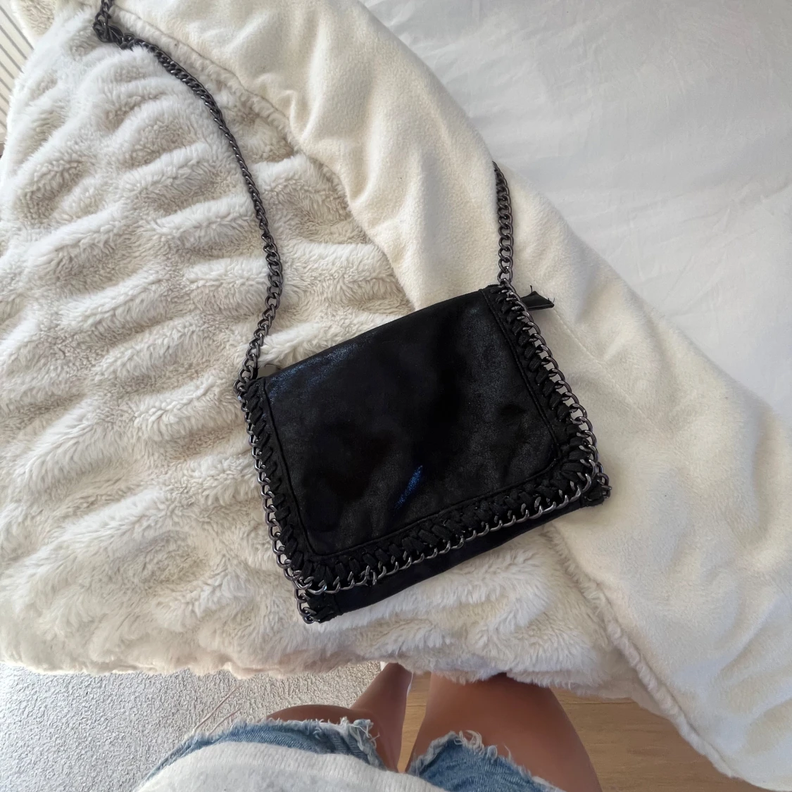 Snygg svart axelväska med kedja som axelrem och coola kedjedetaljer runt kanterna. Väskan har en fyrkantig form och är gjord i mocka, vilket ger en mjuk och lyxig känsla. Perfekt storlek för mobil, plånbok och andra essentials.
