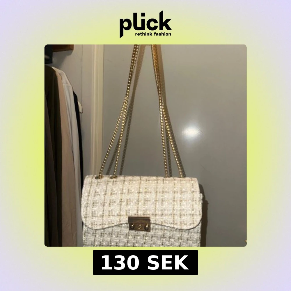 Snygg vit axelväska med quiltat mönster och guldfärgad kedja. Väskan har en elegant design med ett lås framtill och är perfekt för att ge en stilren touch till din outfit.