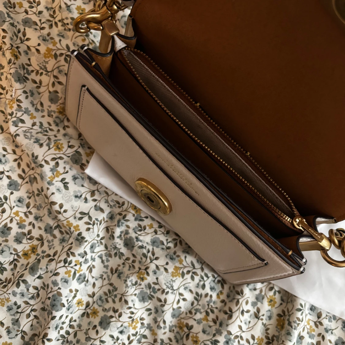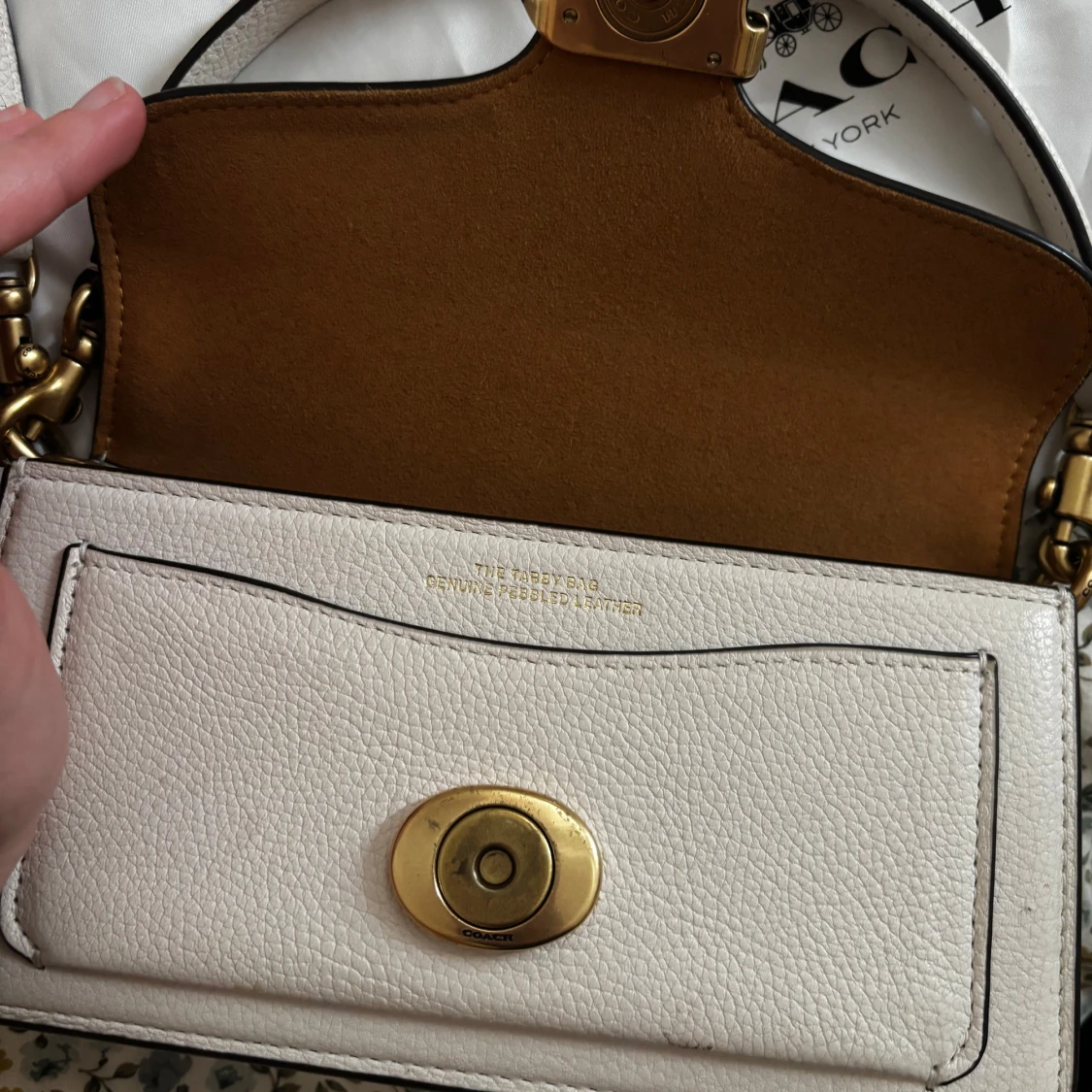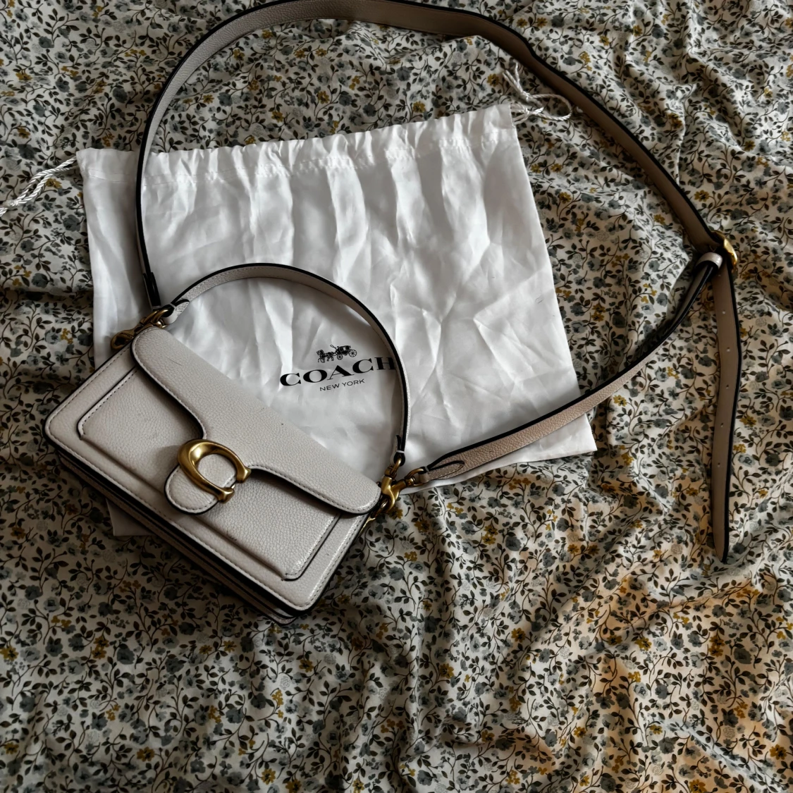 Coach Tabby axelväska i ljusbeige skinn med guldfärgade metalldetaljer och klassiskt C-spänne. H- 11cm L- 20cm B-7cm