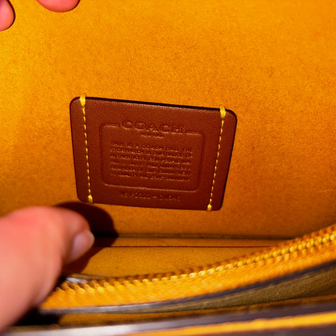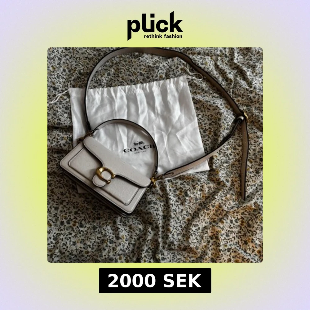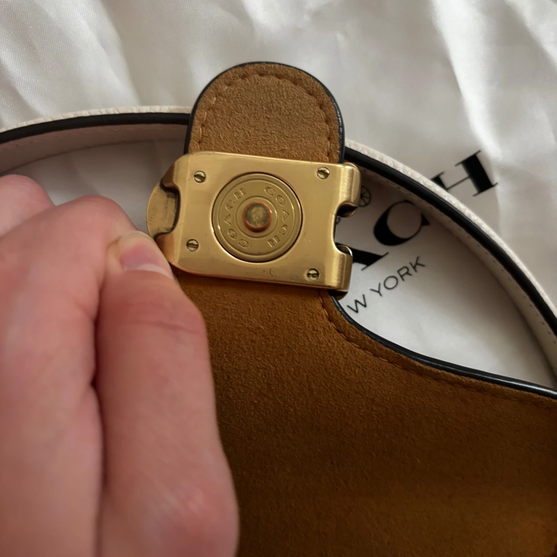 Coach Tabby axelväska i ljusbeige skinn med guldfärgade metalldetaljer och klassiskt C-spänne. H- 11cm L- 20cm B-7cm