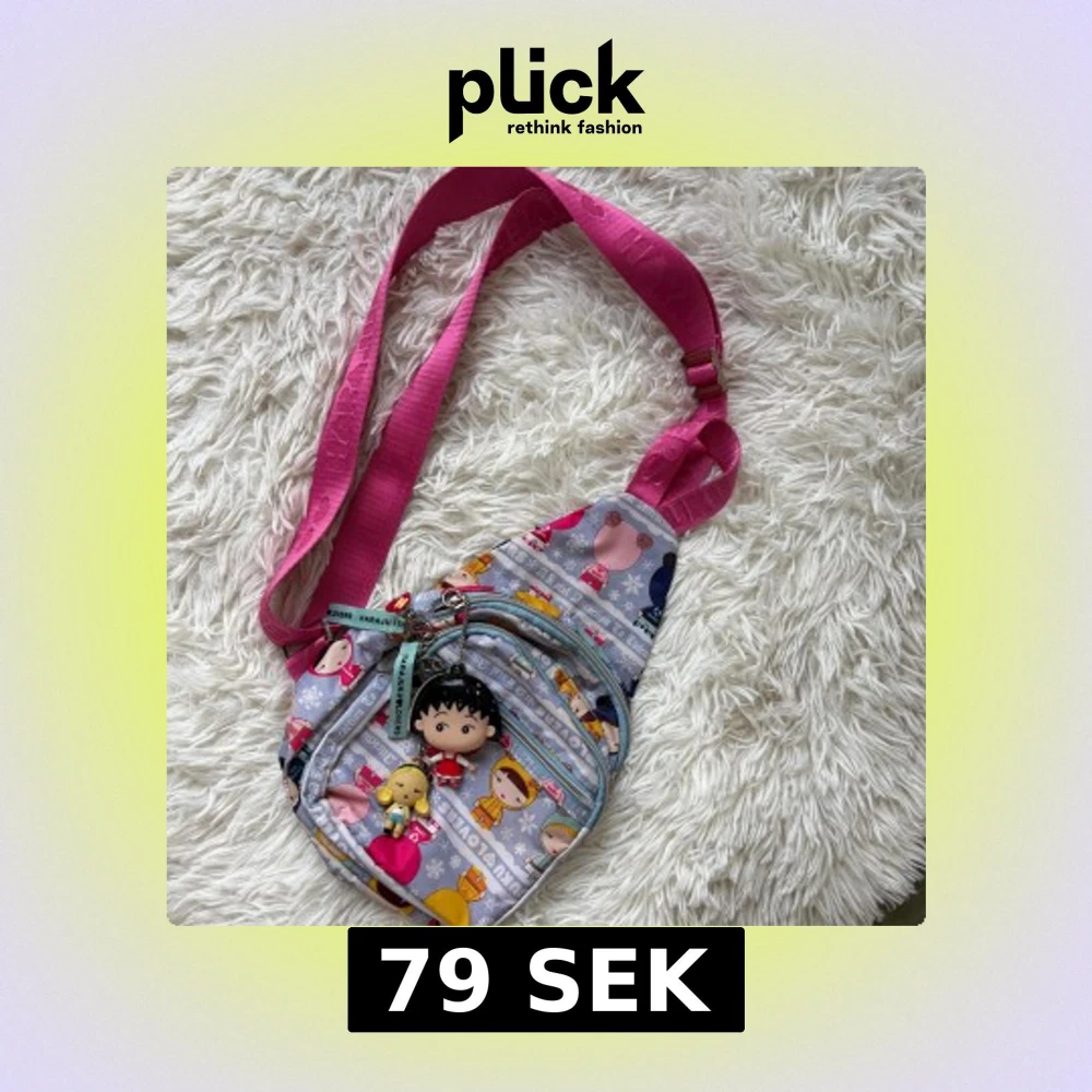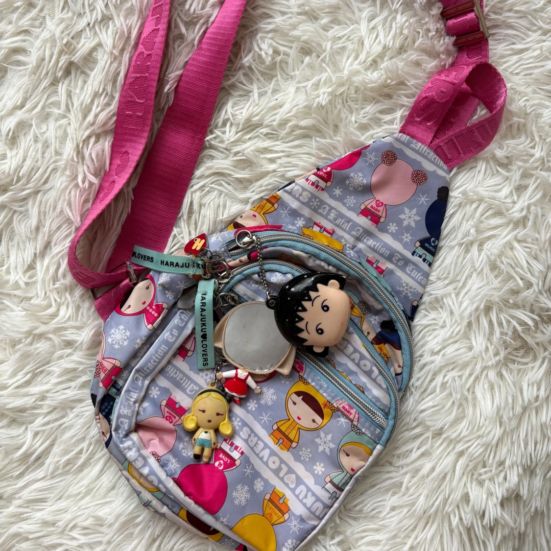 Superfin axelväska från Harajuku Lovers med färgglatt figurmönster på ljusblå botten och bred rosa axelrem. Väskan har flera dragkedjefack och söta nyckelringar som detaljer. Perfekt för dig som gillar unika accessoarer med japansk streetstyle-vibe.