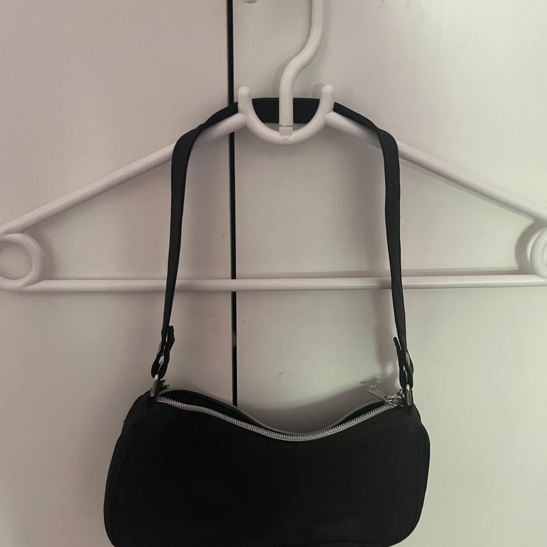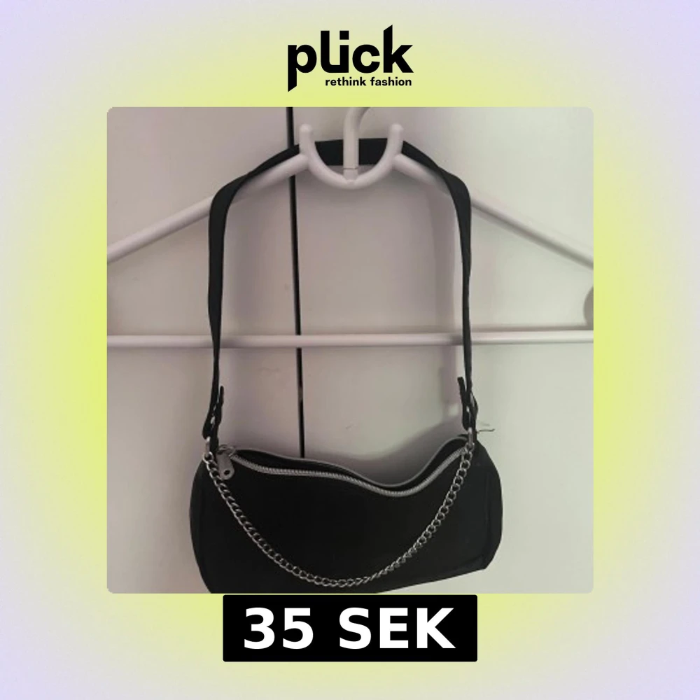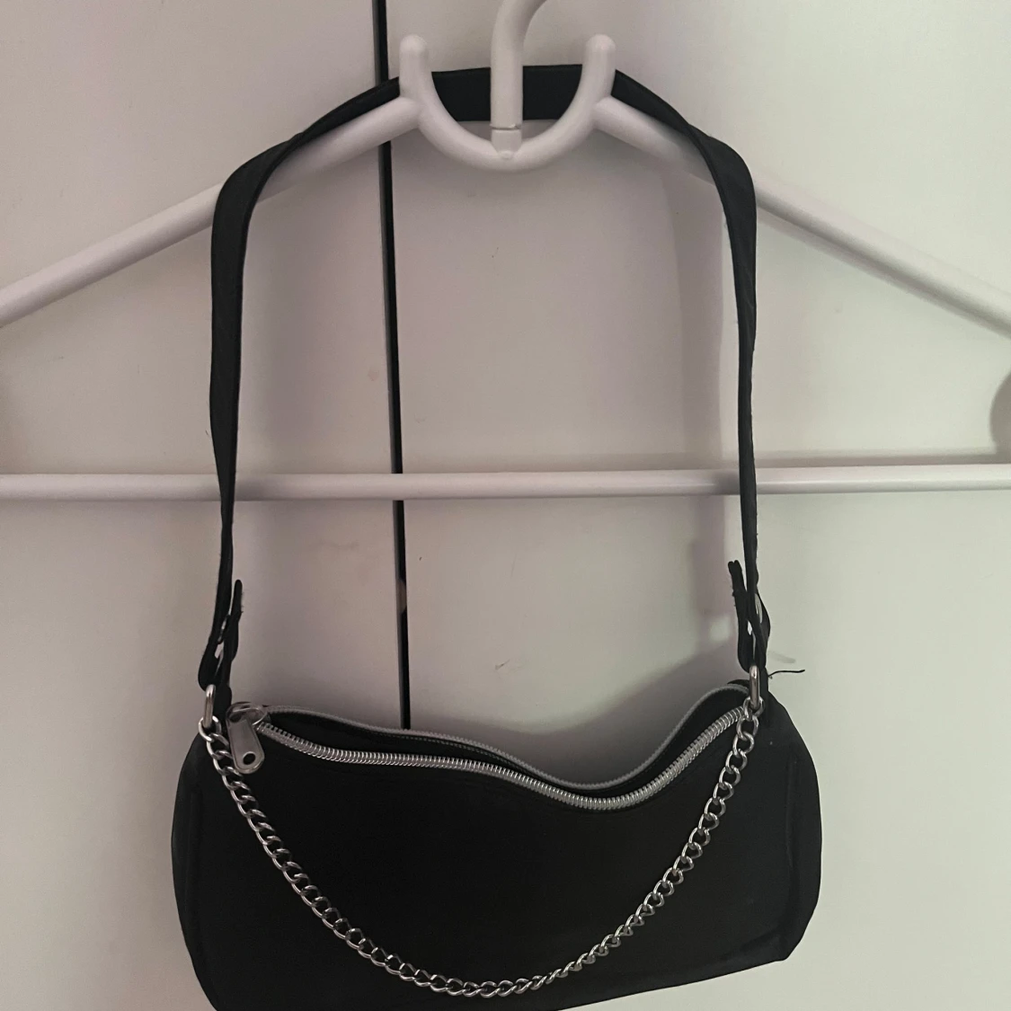 Säljer en svart axelväska i syntetmaterial med silvrig dragkedja och en snygg kedjedetalj framtill. Väskan har en enkel, stilren design och en justerbar axelrem. Perfekt storlek för det viktigaste och passar till många olika outfits.