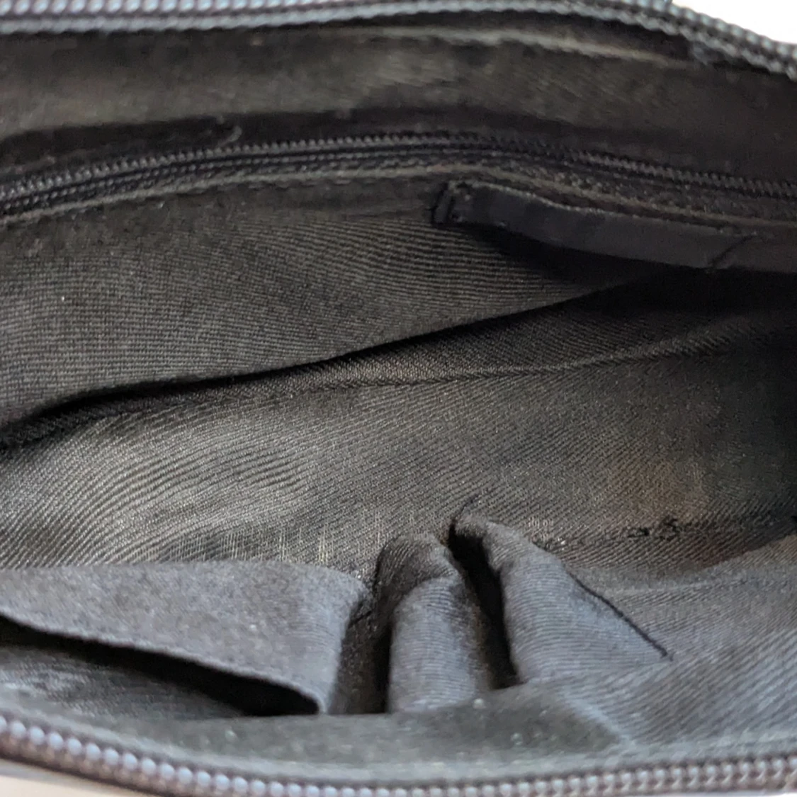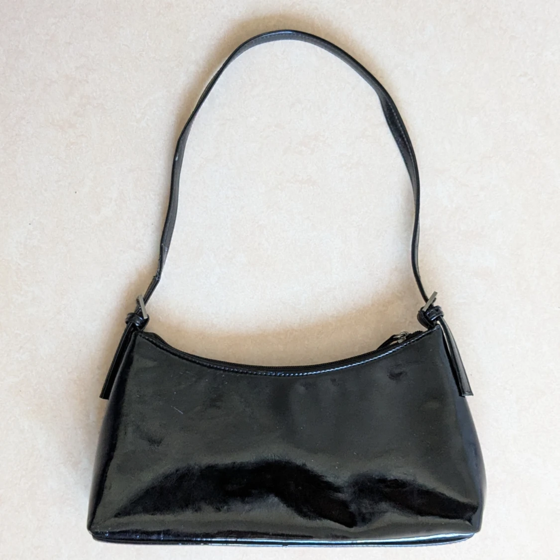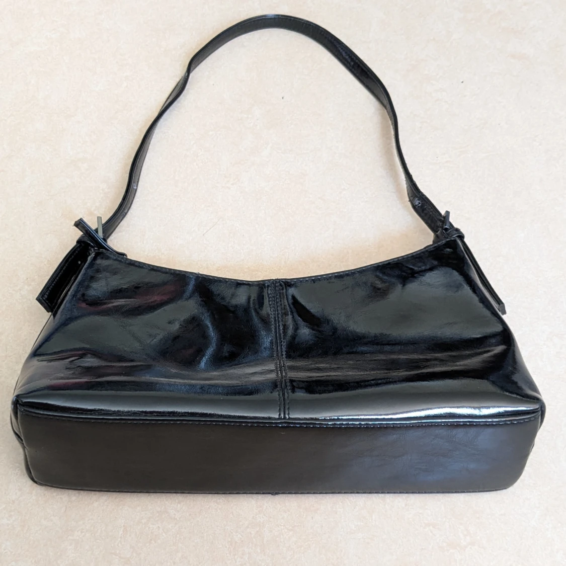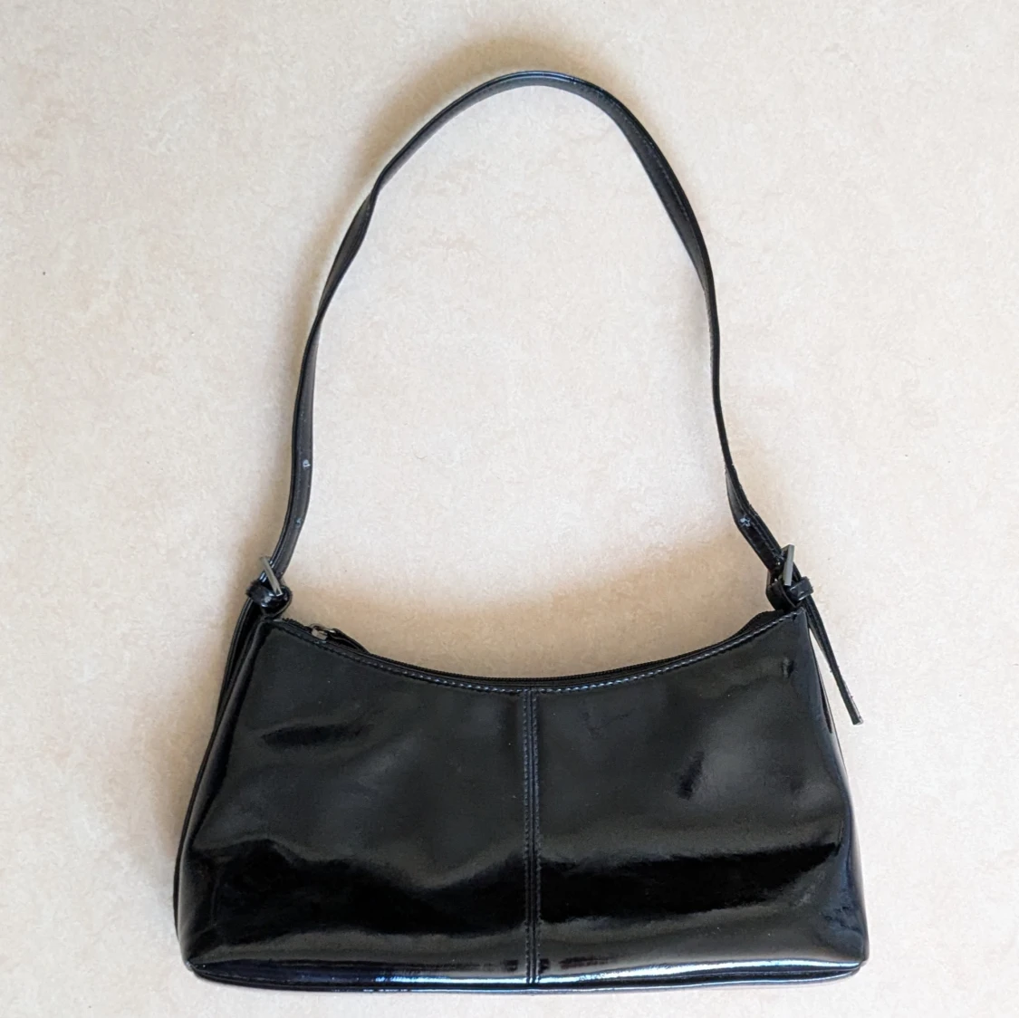 Snygg svart axelväska med stilren avlång form och justerbar axelrem. Väskan har dragkedja upptill och ett rymligt innerfack med extra fickor. Perfekt för dig som gillar minimalistisk och klassisk stil. På ett flertal ställen på väskan syns märken efter slitage för att jag har använt väskan vid flertal tillfällen.