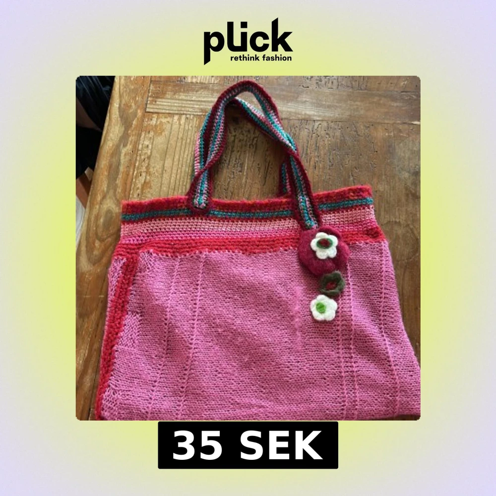 Unik stickad väska i rosa med ränder i rött, grönt och blått på handtagen. Väskan har virkade blommor i filt som dekoration framtill och är rymlig med en mjuk känsla. Perfekt för dig som gillar färg och handgjorda detaljer.
