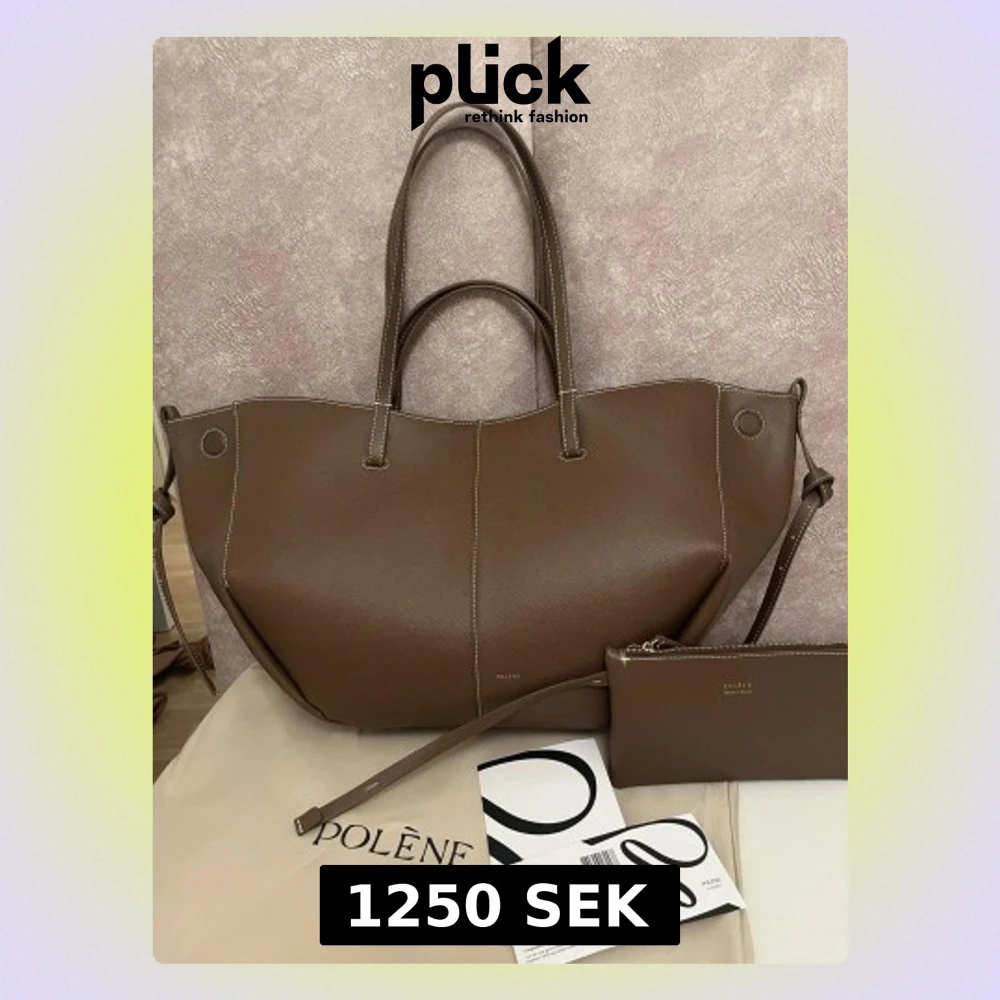 Snygg brun axelväska från Polène med stilren design och vita kontrastsömmar. Väskan är tillverkad i strukturerat skinn och har både korta och långa handtag samt en matchande plånbok. Perfekt storlek för allt du behöver och riktigt chic form.
