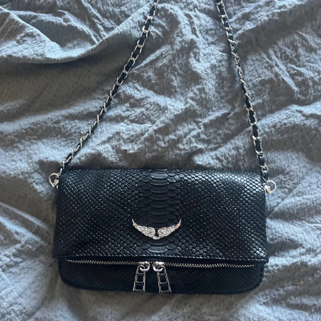 Snygg svart axelväska i skinnimitation med ormmönstrad struktur. Väskan har silverfärgade detaljer, dubbla dragkedjor framtill och en bakficka med dragkedja. Kedjerem med inslag av svart material och en cool vingdetalj på framsidan.