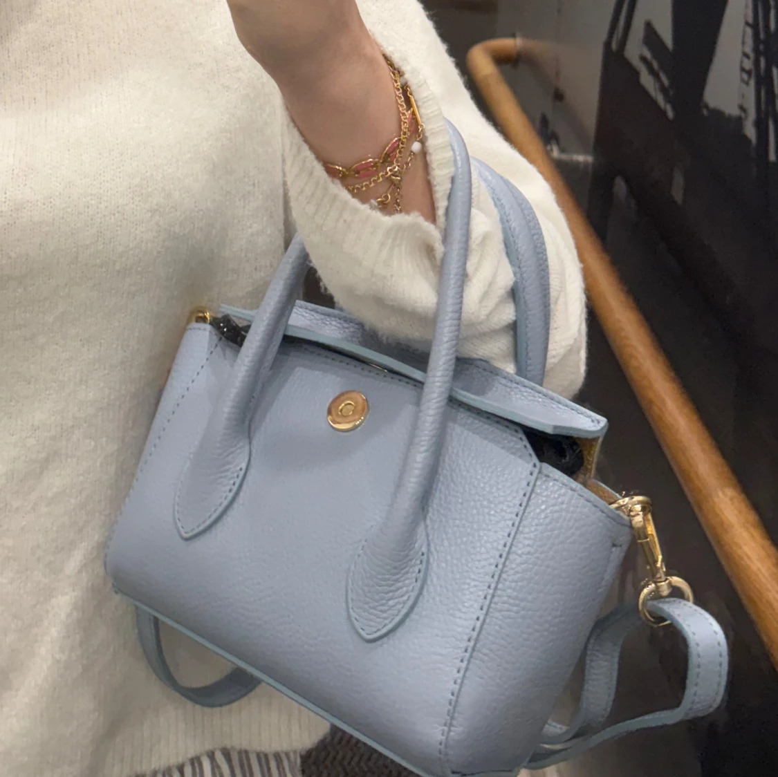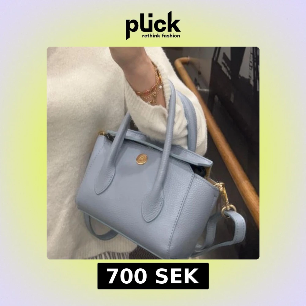 Snygg ljusblå axelväska i skinn med guldfärgade detaljer och ett justerbart axelband. Väskan har två handtag och stängs med en knapp framtill. Väskan är köpt på Raglady och är en av dom nyare märkena Latalia dom fått in.